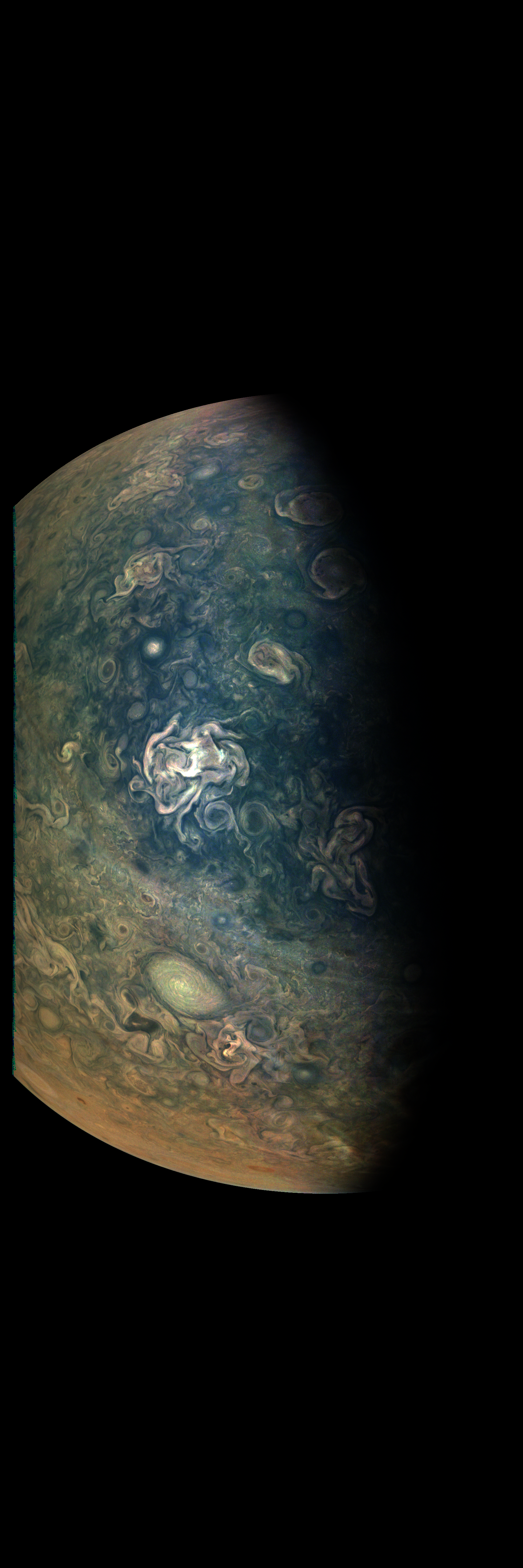 Junocam pixels are 12 bits deep from the camera but are converted to 8 bits inside the instrument using a lossless "companding" table, a process similar to gamma correction, to reduce their size. All Junocam products on the missionjuno website are in this 8-bit form as received on Earth. Scientific users interested in radiometric analysis should use the "RDR" data products archived with the Planetary Data System, which have been converted back to a linear 12-bit scale.