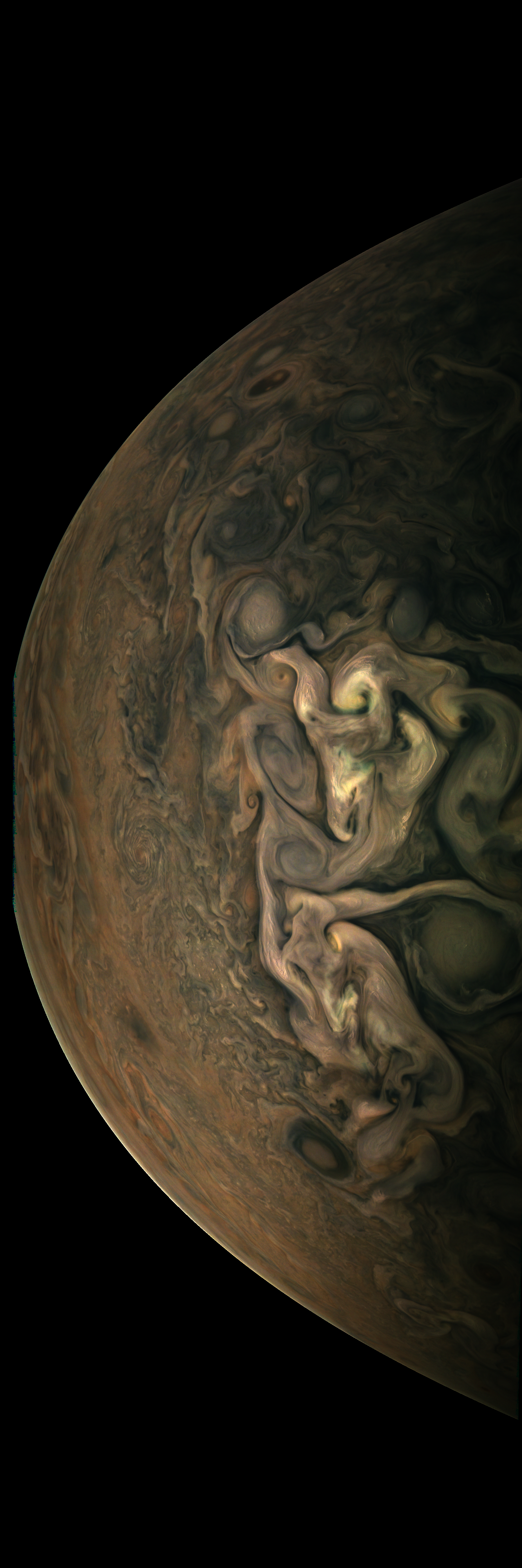 Junocam pixels are 12 bits deep from the camera but are converted to 8 bits inside the instrument using a lossless "companding" table, a process similar to gamma correction, to reduce their size. All Junocam products on the missionjuno website are in this 8-bit form as received on Earth. Scientific users interested in radiometric analysis should use the "RDR" data products archived with the Planetary Data System, which have been converted back to a linear 12-bit scale.