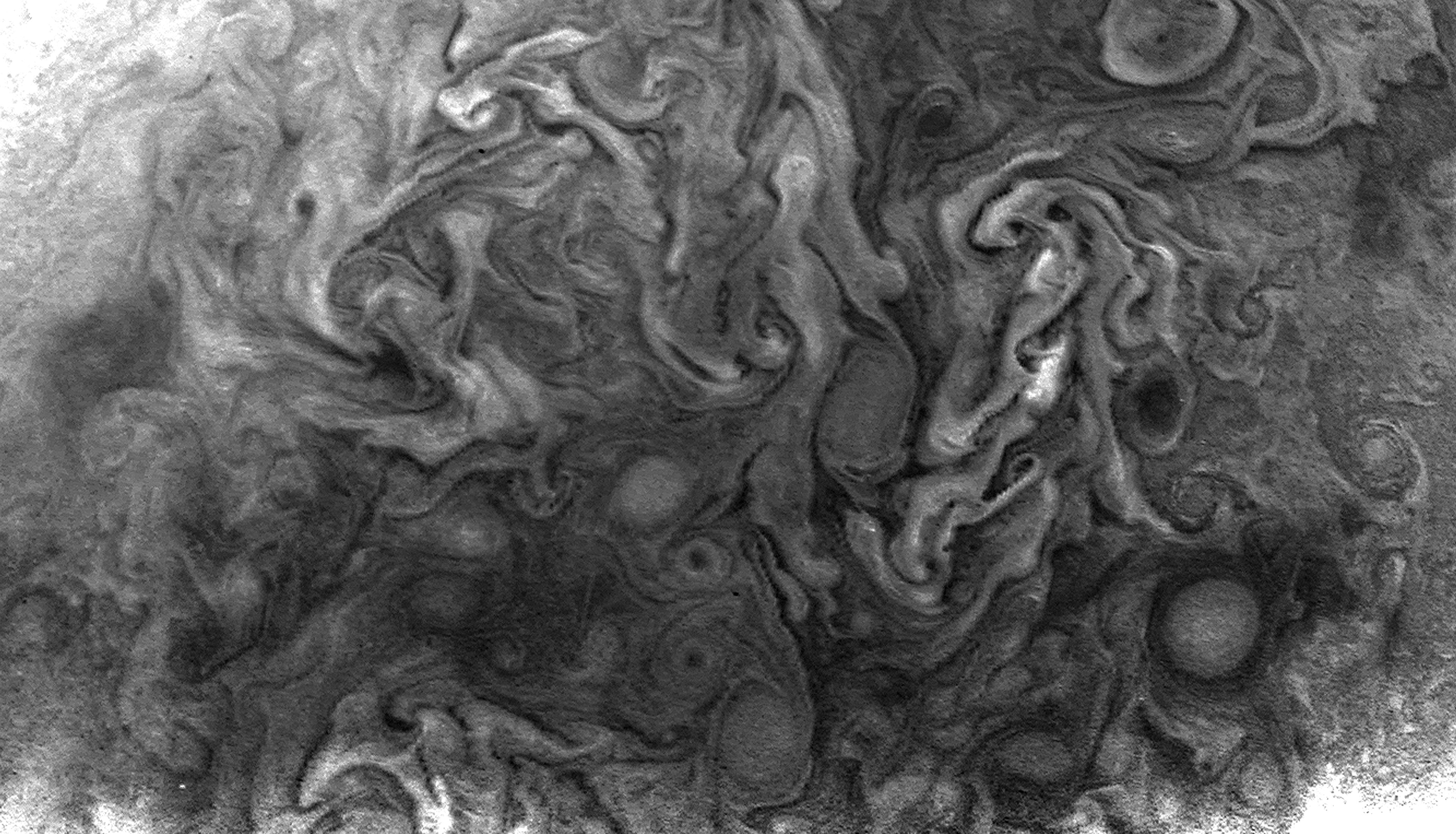 Junocam pixels are 12 bits deep from the camera but are converted to 8 bits inside the instrument using a lossless "companding" table, a process similar to gamma correction, to reduce their size. All Junocam products on the missionjuno website are in this 8-bit form as received on Earth. Scientific users interested in radiometric analysis should use the "RDR" data products archived with the Planetary Data System, which have been converted back to a linear 12-bit scale.