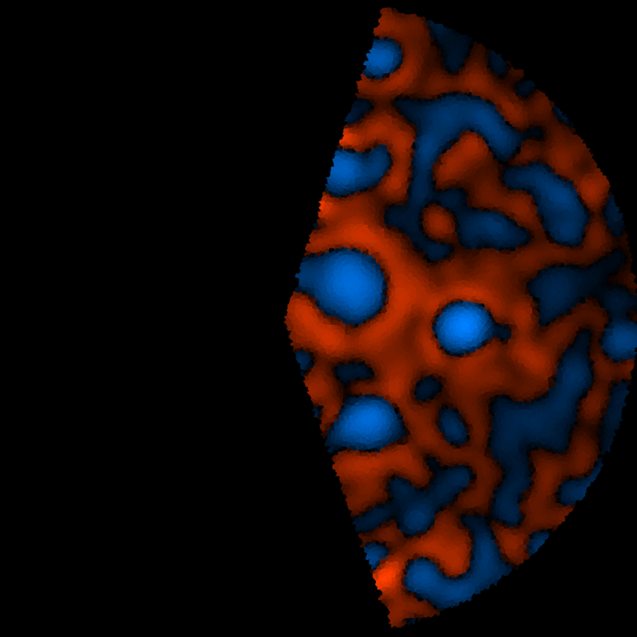 Relative vorticities are encoded in color, blue for cyclonic, orange for anticyclonic relative vorticity. The animated gif covers 48 hours, with one frame per real-time hour. Played with 25 fps, the result is a 90,000-fold time-lapsed animation.