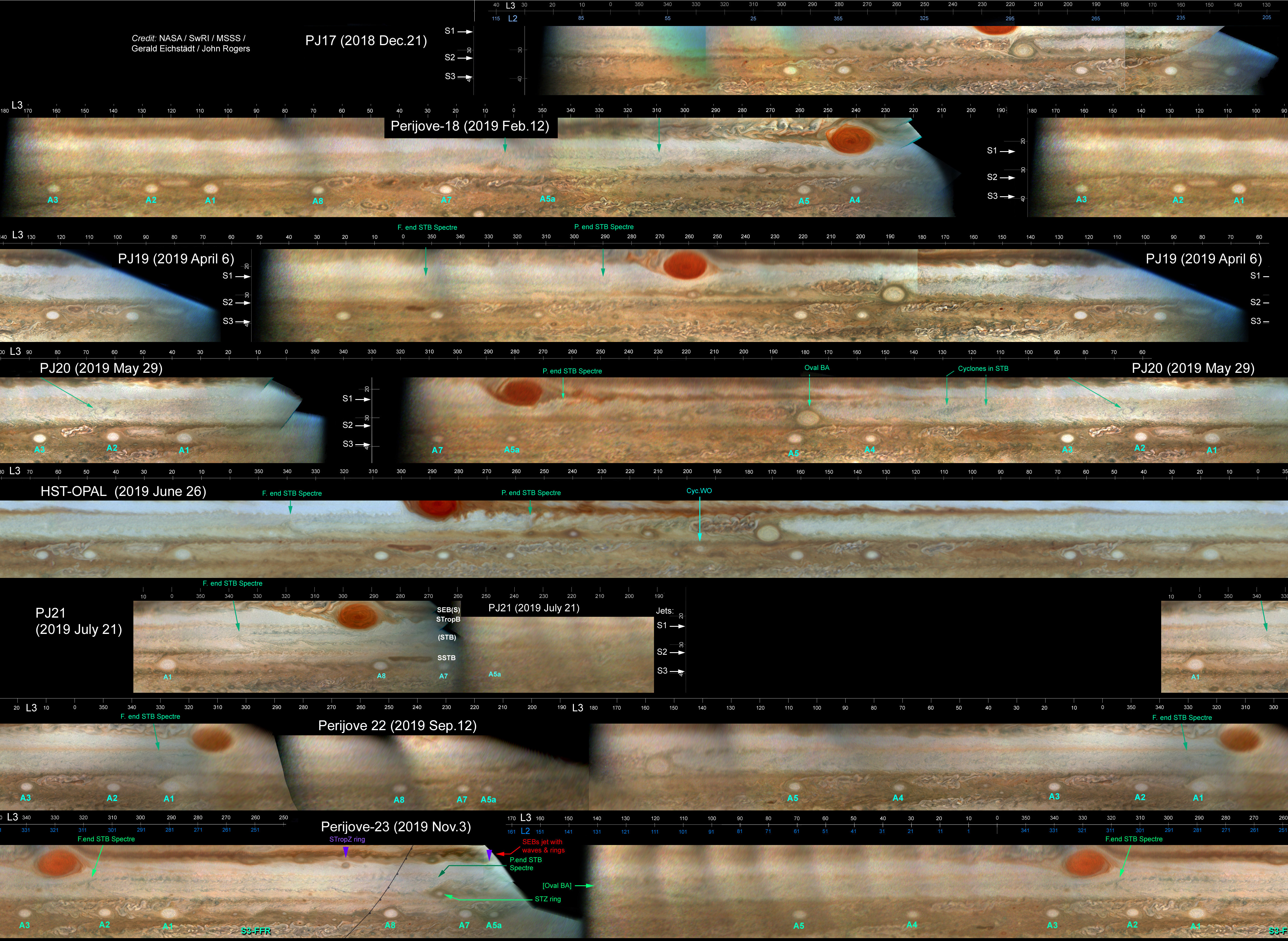 This set of strip-maps shows Jupiter's South Temperate domain (between the S1 and S2 jets, as marked) and S.S. Temperate domain (between the S2 and S3 jets), from PJ17 to PJ23. They are taken from the planet-wide maps posted in our reports on each perijove (on the Think Tank page and the BAA Jupiter Section web site). It is aligned on the S2-AWOs (long-lived white ovals labelled A1 to A8), so as to show the changes in the cyclonic intervals between them. The GRS and Oval BA are also included. To minimise discontinuities, 90 deg of each map is repeated. This is Figure 17 from our latest report on Jupiter in 2019, which is otherwise derived from ground-based images, posted on the BAA Jupiter Section web site: direct link: https://www.britastro.org/node/20350