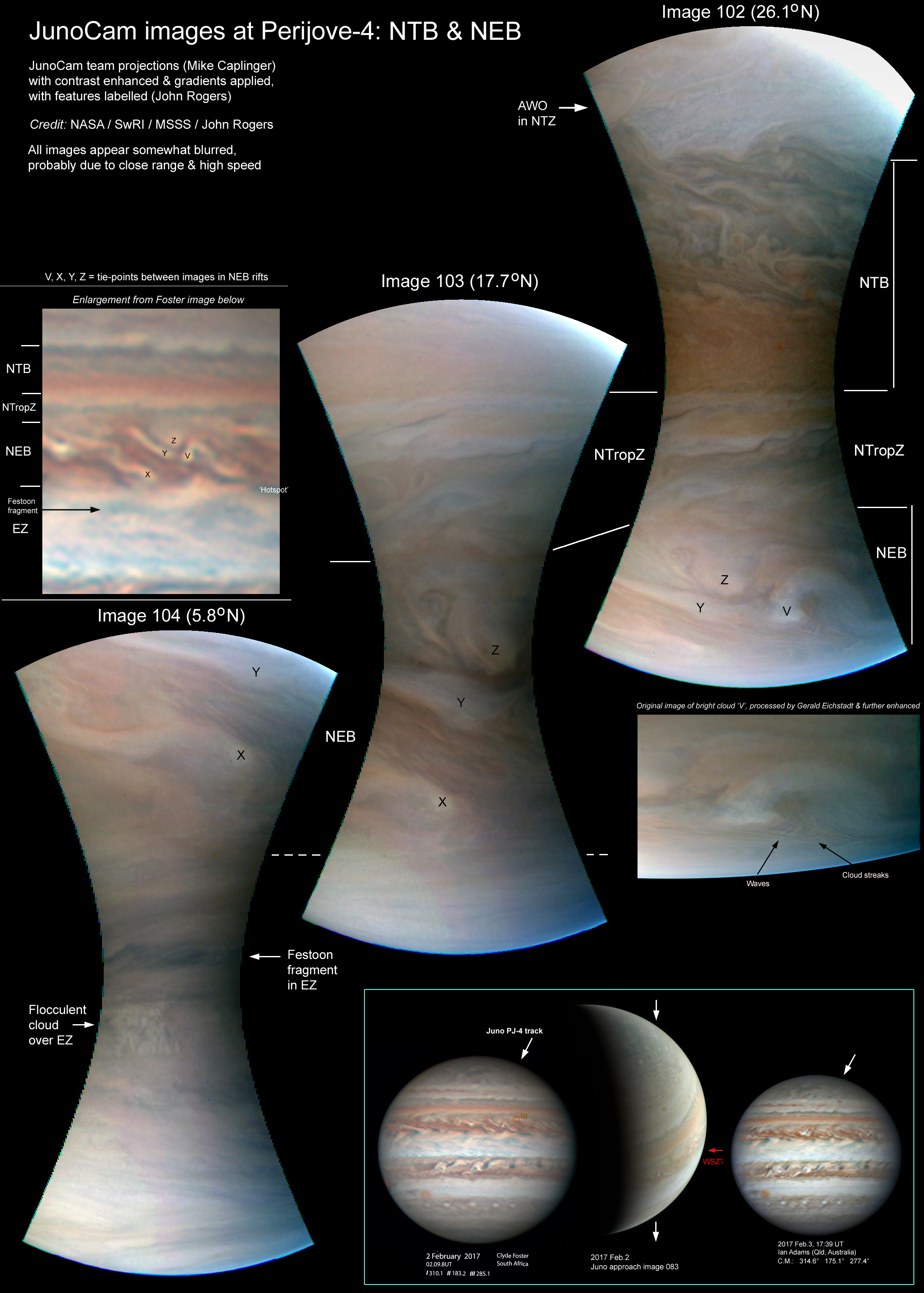 This set shows the 3 images covering the NTB and NEB, along with amateur images and an inbound Juno image which put them in context. They can be compared with PJ-3 images 109-111, taken at almost the same latitudes. The reviving NTB has developed well-defined edges and its turbulent north component has become dark grey, while the south component ("Big red stripe") is still striking. The N. Tropical Zone still contains dramatic streaks in orange and dark grey and white. In the NEB, the images successfully captured some highly active 'rifts' (convective storms). On the NEB south edge, we see a fragments of a blue-grey festoon rather than a hot spot, and a raft of white clouds in the EZ which seems to cast shadows. --John Rogers