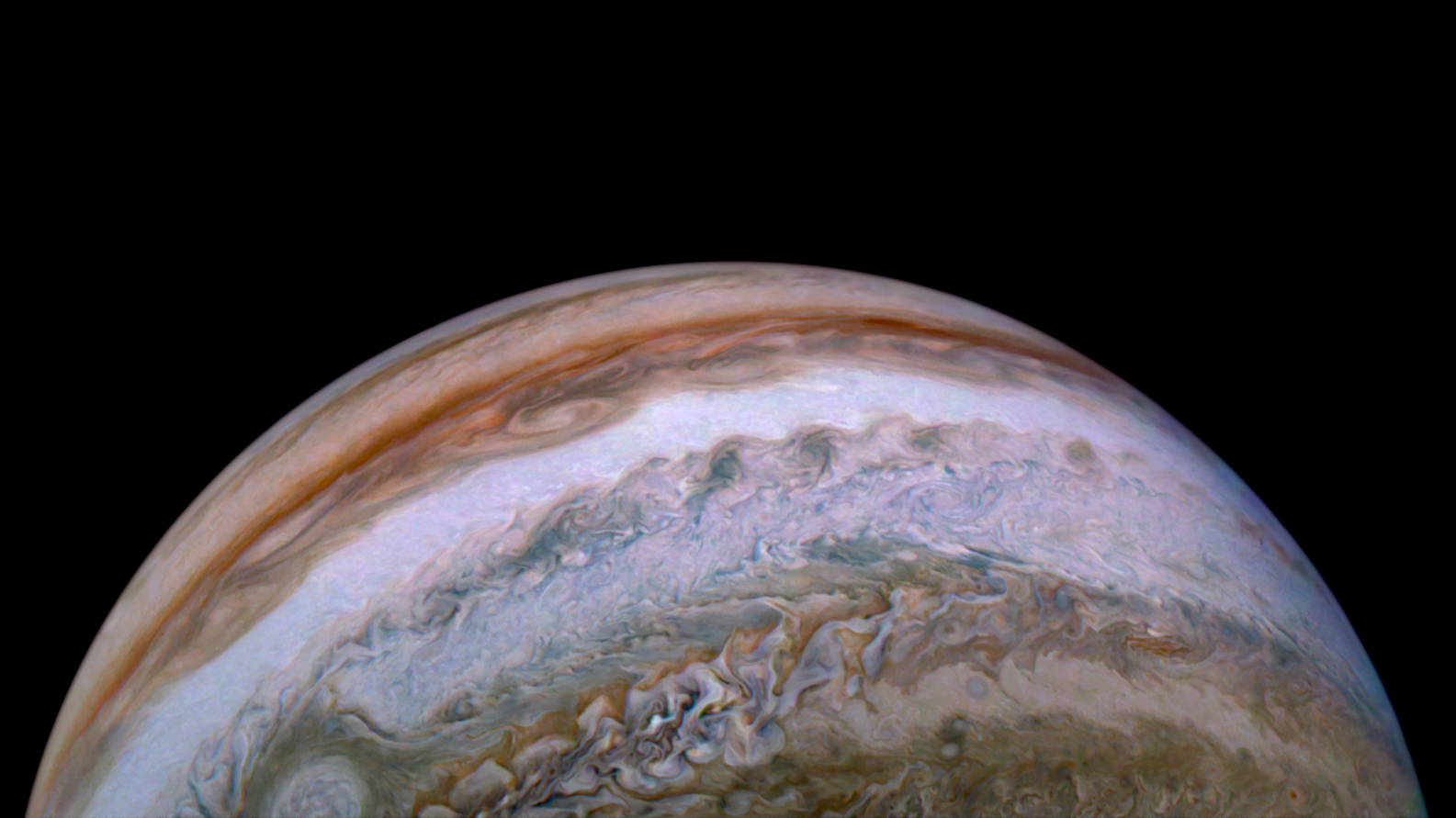 Processed using the JunoCam imager's PJ24 JET S4 raw images and data from NASA's Juno spacecraft flyby on December 26, 2019. Enhanced to highlight features, clouds, colours, and the beauty of Jupiter. Artist's impression - not representative of true colour.