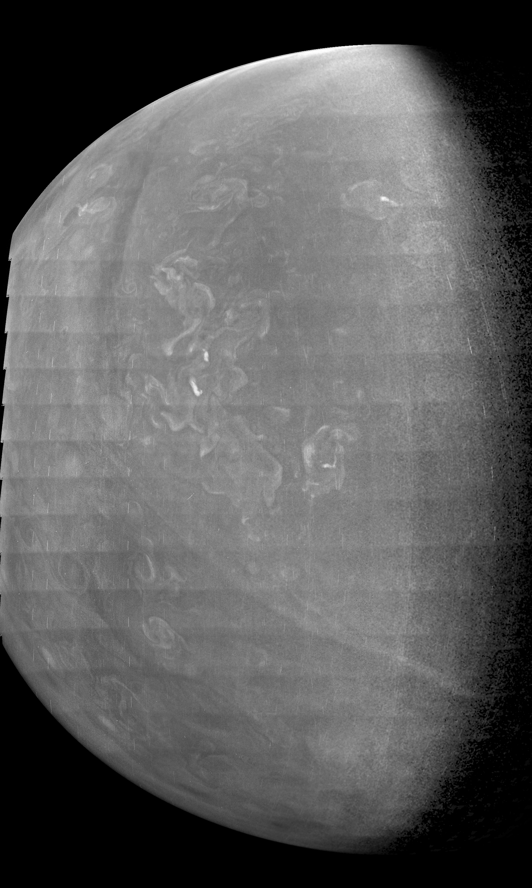 This is a composite view derived from PJ25 images 13 & 16 & 19 in the methane band. Gerald Eichstädt processed the images and reprojected them as from a common viewpoint, exactly matching that of the colour composite. I have merged the three images and adjusted the intensities so as to enhance details. The small, very bright spots are convective clouds (thunderstorms) in the chaotic cyclonic regions. Surprisingly, the methane-bright North Polar Hood is not obvious, possibly because of the way the viewing angle varies across the globe. But the long linear bands in the ‘Bland Zone’, seen in the colour image, are also visible in the methane image, and in some sectors they make a sharp southern edge to the Polar Hood.