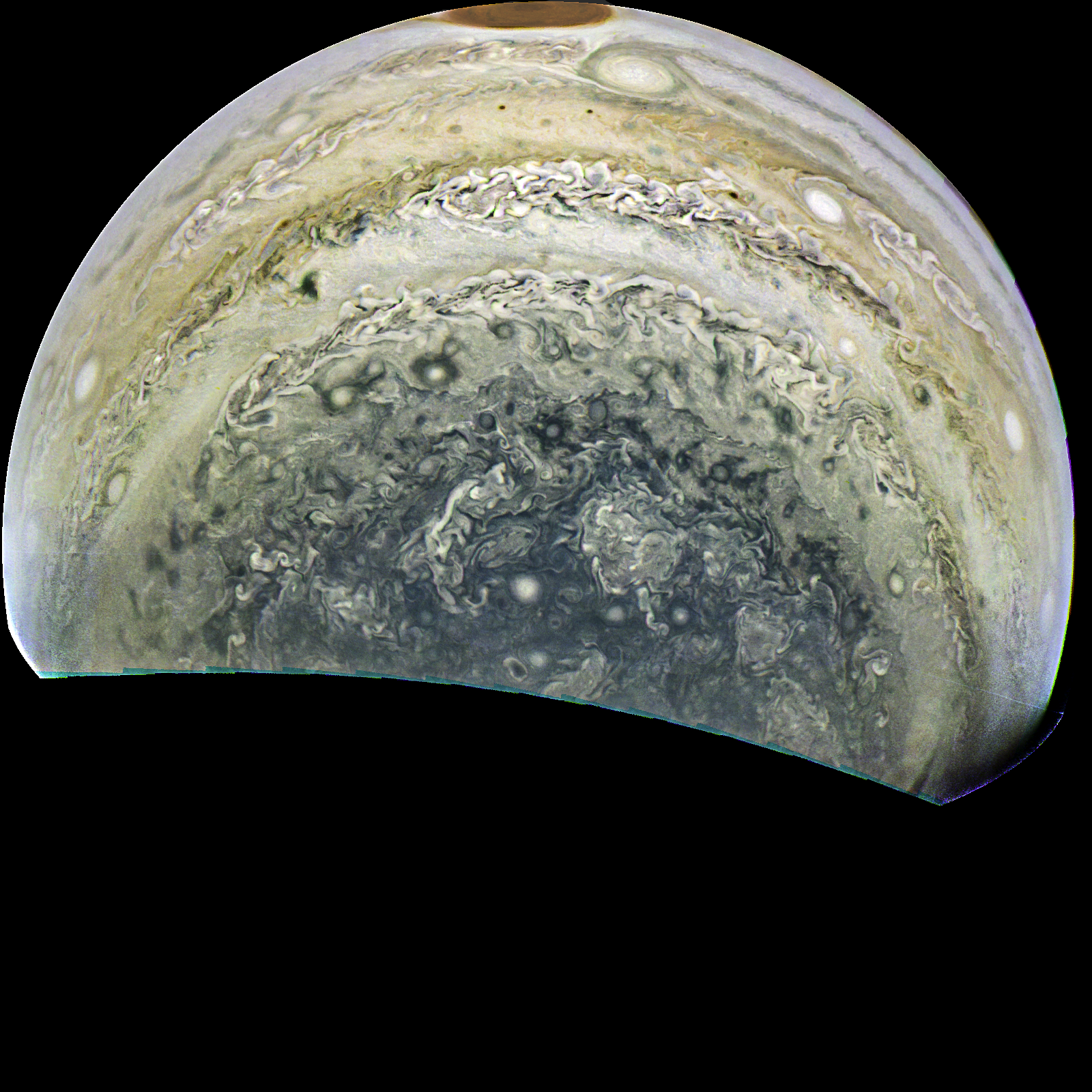 Junocam pixels are 12 bits deep from the camera but are converted to 8 bits inside the instrument using a lossless "companding" table, a process similar to gamma correction, to reduce their size. All Junocam products on the missionjuno website are in this 8-bit form as received on Earth. Scientific users interested in radiometric analysis should use the "RDR" data products archived with the Planetary Data System, which have been converted back to a linear 12-bit scale.