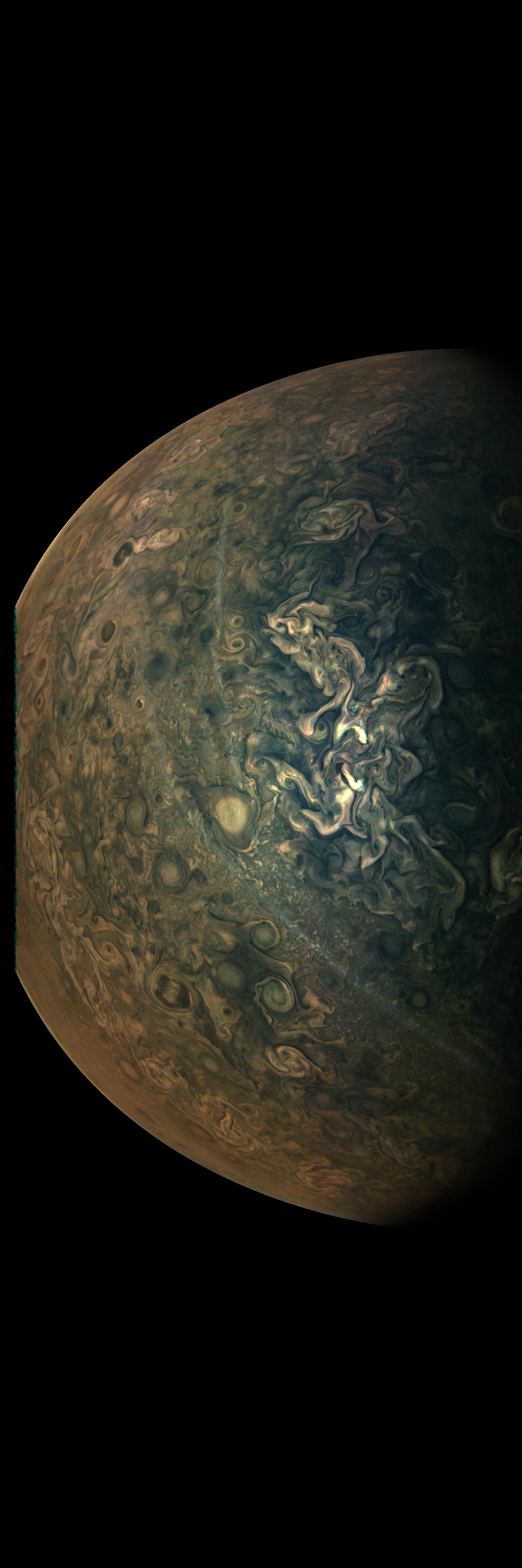 Junocam pixels are 12 bits deep from the camera but are converted to 8 bits inside the instrument using a lossless "companding" table, a process similar to gamma correction, to reduce their size. All Junocam products on the missionjuno website are in this 8-bit form as received on Earth. Scientific users interested in radiometric analysis should use the "RDR" data products archived with the Planetary Data System, which have been converted back to a linear 12-bit scale.