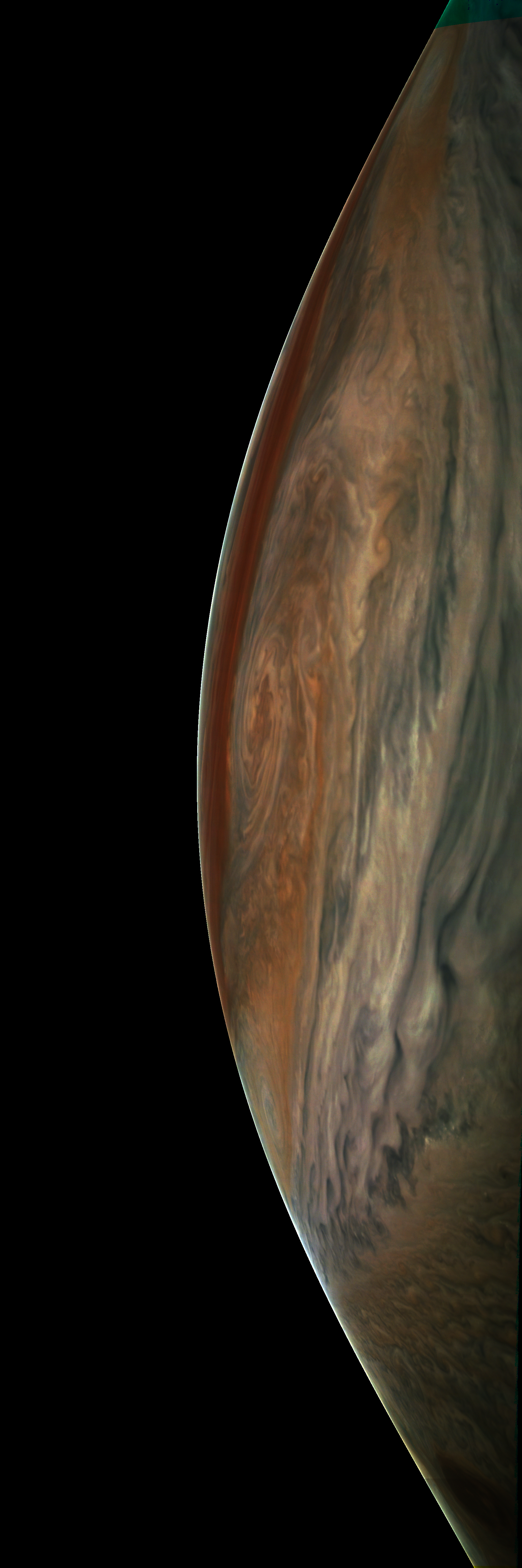Resolution is 30 pixels per degrees in an equidistant cylindrical system centered to the camera at image stop time, with an axis parallel to Juno's spin axis. The rendered field of view is 60x180 degrees.