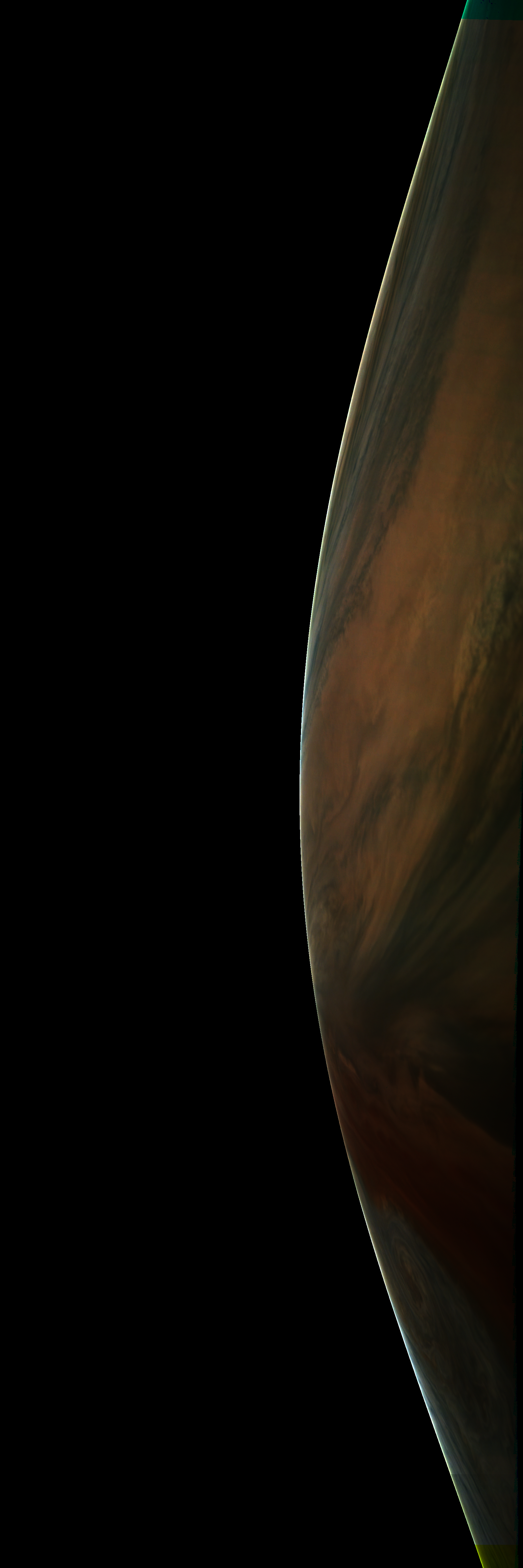 Resolution is 30 pixels per degrees in an equidistant cylindrical system centered to the camera at image stop time, with an axis parallel to Juno's spin axis. The rendered field of view is 60x180 degrees.