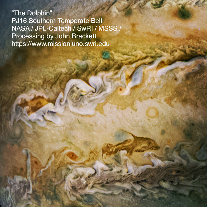 The Dolphin cloud formation in the Southern Temperate Belt as imaged on PJ16. (Color and Contrast Enhanced)