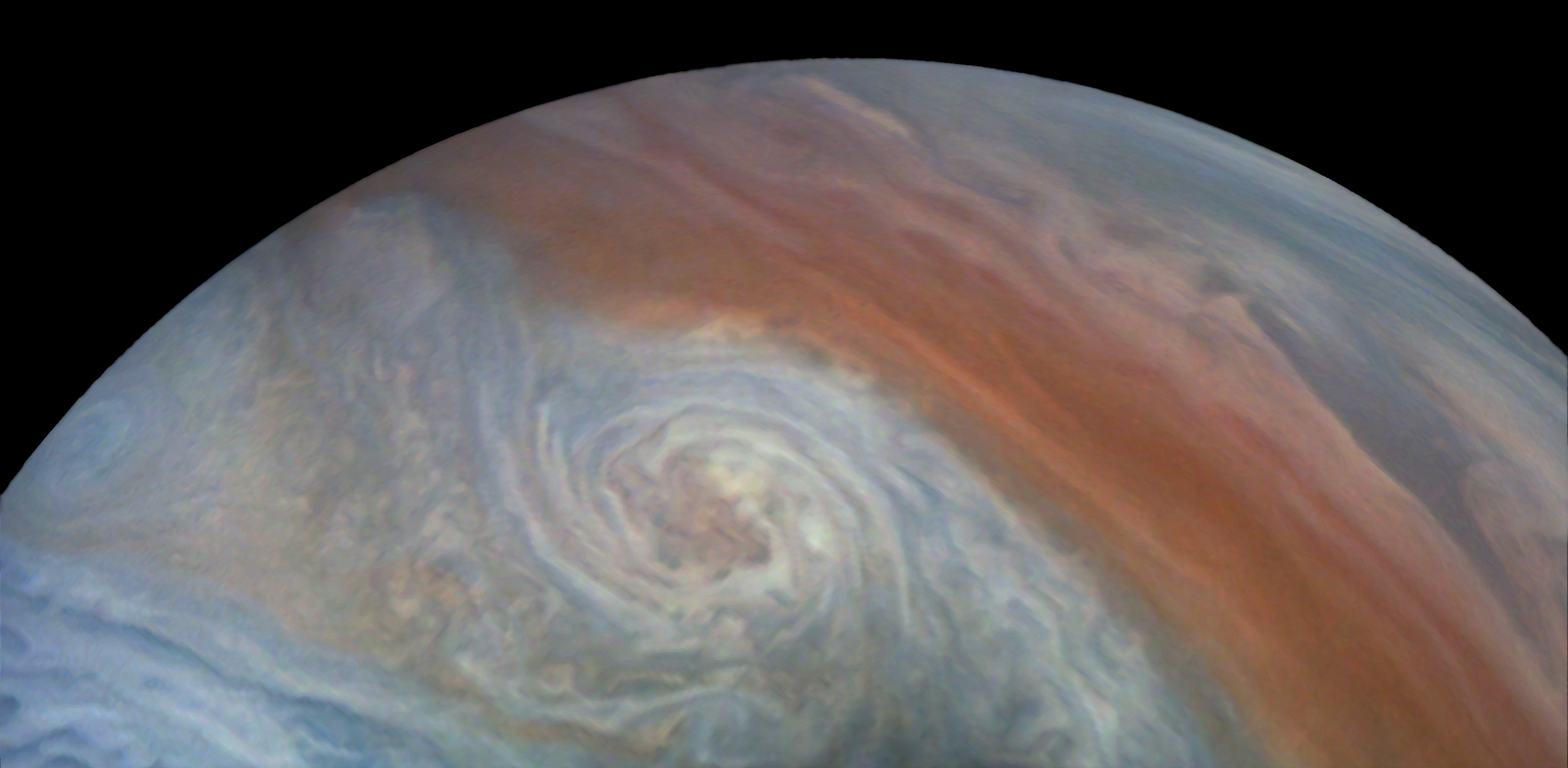 Junocam pixels are 12 bits deep from the camera but are converted to 8 bits inside the instrument using a lossless "companding" table, a process similar to gamma correction, to reduce their size. All Junocam products on the missionjuno website are in this 8-bit form as received on Earth. Scientific users interested in radiometric analysis should use the "RDR" data products archived with the Planetary Data System, which have been converted back to a linear 12-bit scale.