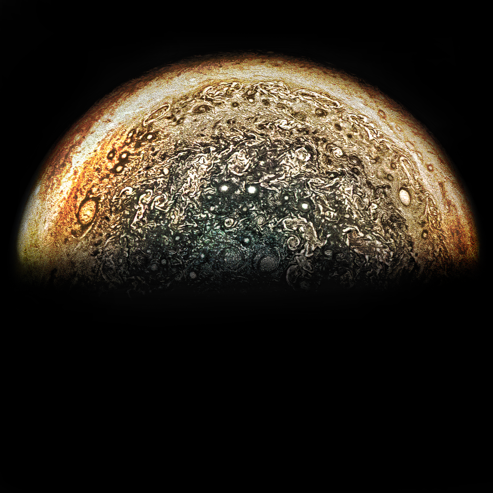 Junocam pixels are 12 bits deep from the camera but are converted to 8 bits inside the instrument using a lossless "companding" table, a process similar to gamma correction, to reduce their size. All Junocam products on the missionjuno website are in this 8-bit form as received on Earth. Scientific users interested in radiometric analysis should use the "RDR" data products archived with the Planetary Data System, which have been converted back to a linear 12-bit scale.