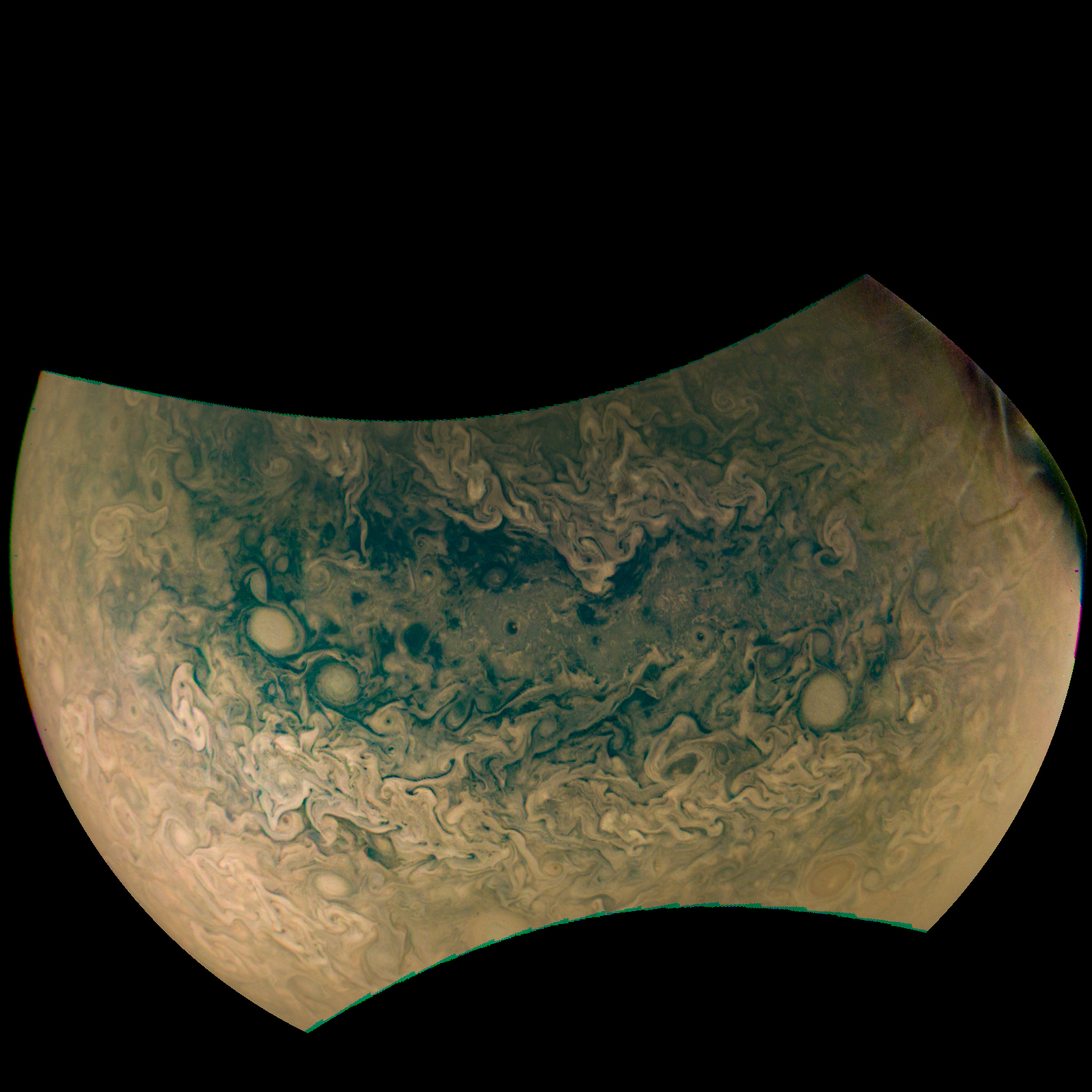 Junocam pixels are 12 bits deep from the camera but are converted to 8 bits inside the instrument using a lossless "companding" table, a process similar to gamma correction, to reduce their size. All Junocam products on the missionjuno website are in this 8-bit form as received on Earth. Scientific users interested in radiometric analysis should use the "RDR" data products archived with the Planetary Data System, which have been converted back to a linear 12-bit scale.