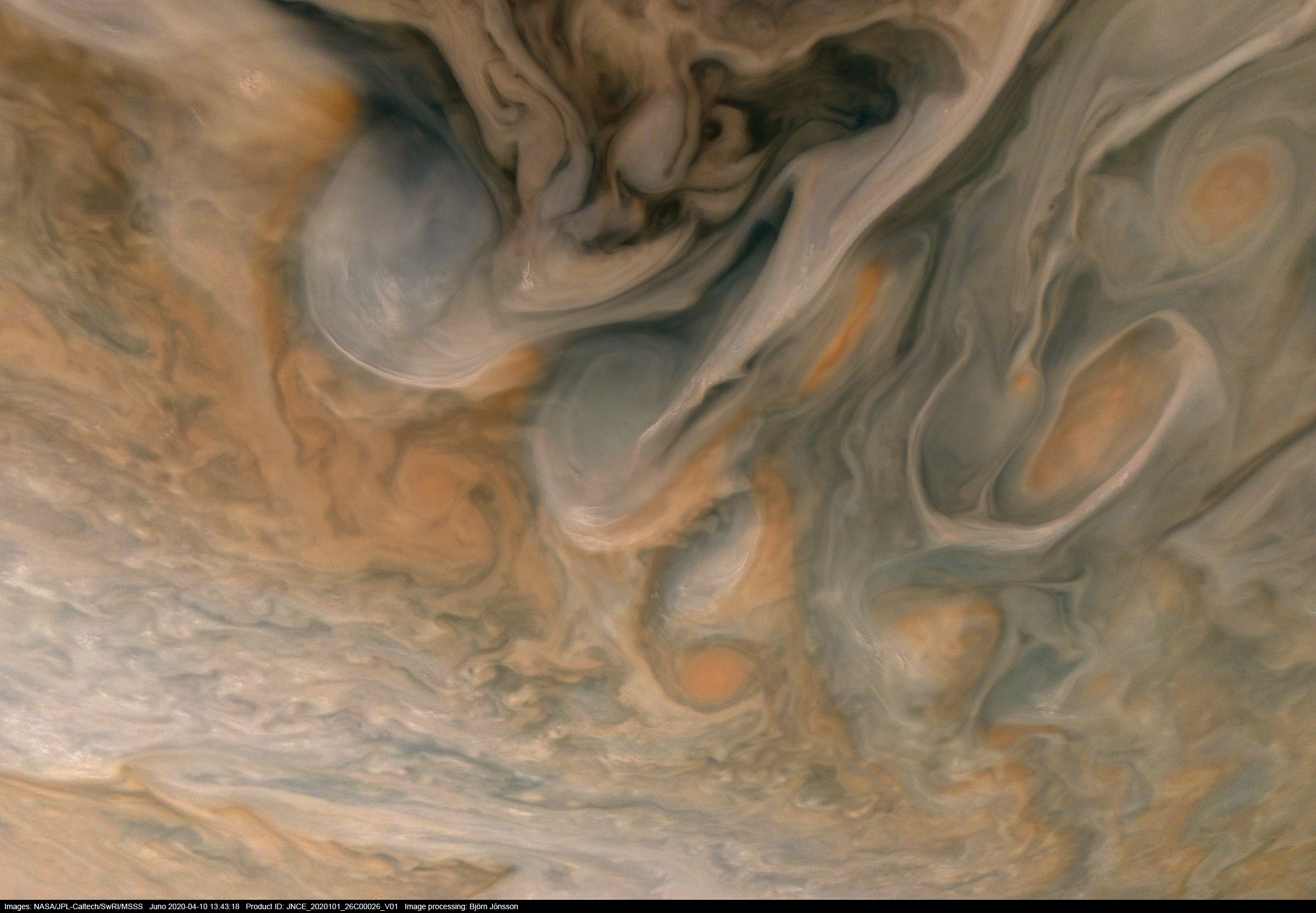 An image processed from the PJ26_26 raw image framelets. The contrast has been increased and color differences enhanced.