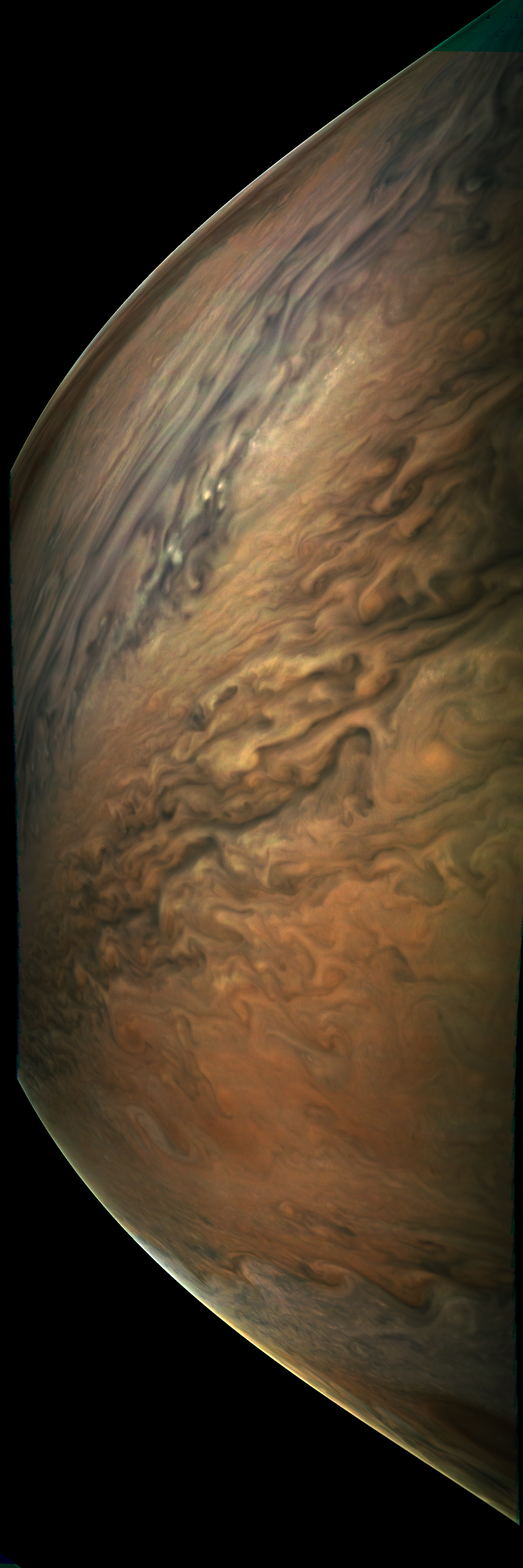 Resolution is 30 pixels per degrees in an equidistant cylindrical system centered to the camera at image stop time, with an axis parallel to Juno's spin axis. The rendered field of view is 60x180 degrees.