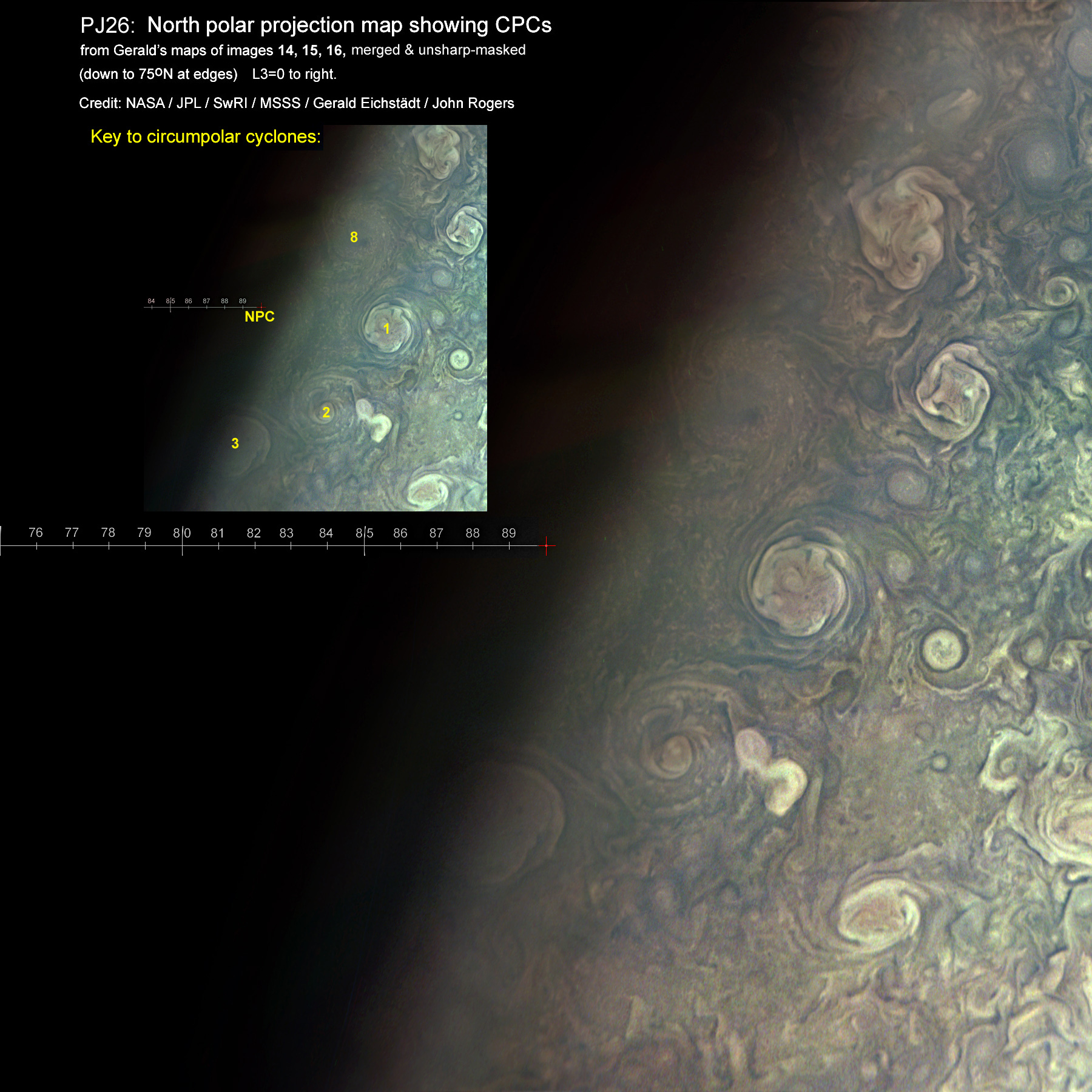 This is a north polar projection map compiled from Gerald Eichstädt's maps of 3 images. Four circumpolar cyclones are well shown, still in a nice regular arrangement around the pole, and some outer parts of the central north polar cyclone.