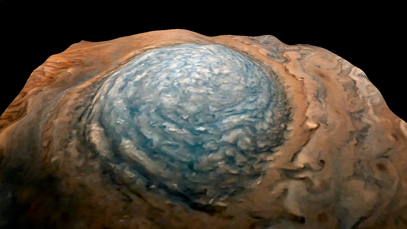 A storm oval passing over the Jovian canopy swirling with pearl activity.