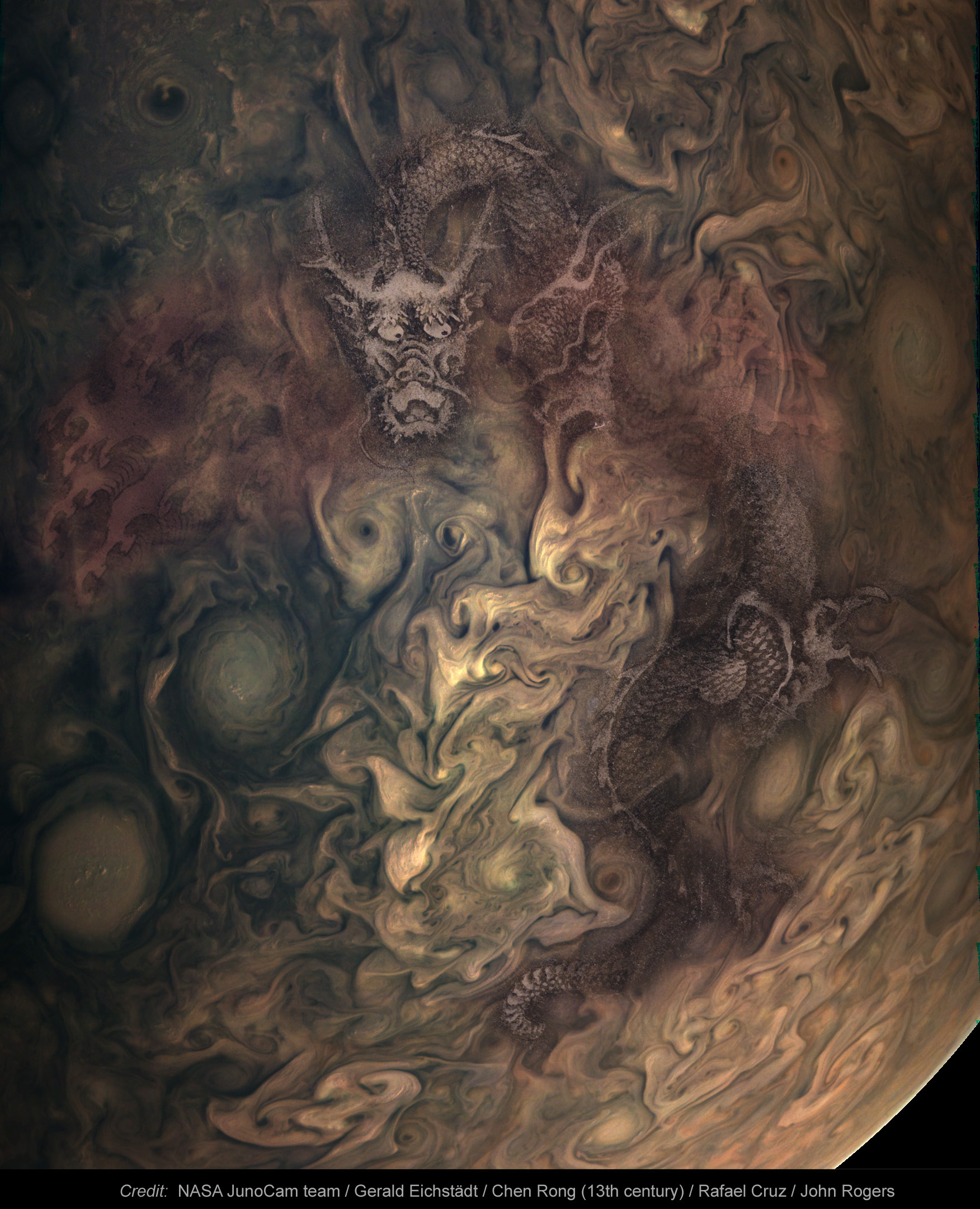 This is another of Chen Rong's ancient Chinese dragons, emerging from the dramatic chaos of Jupiter's northern hemisphere.