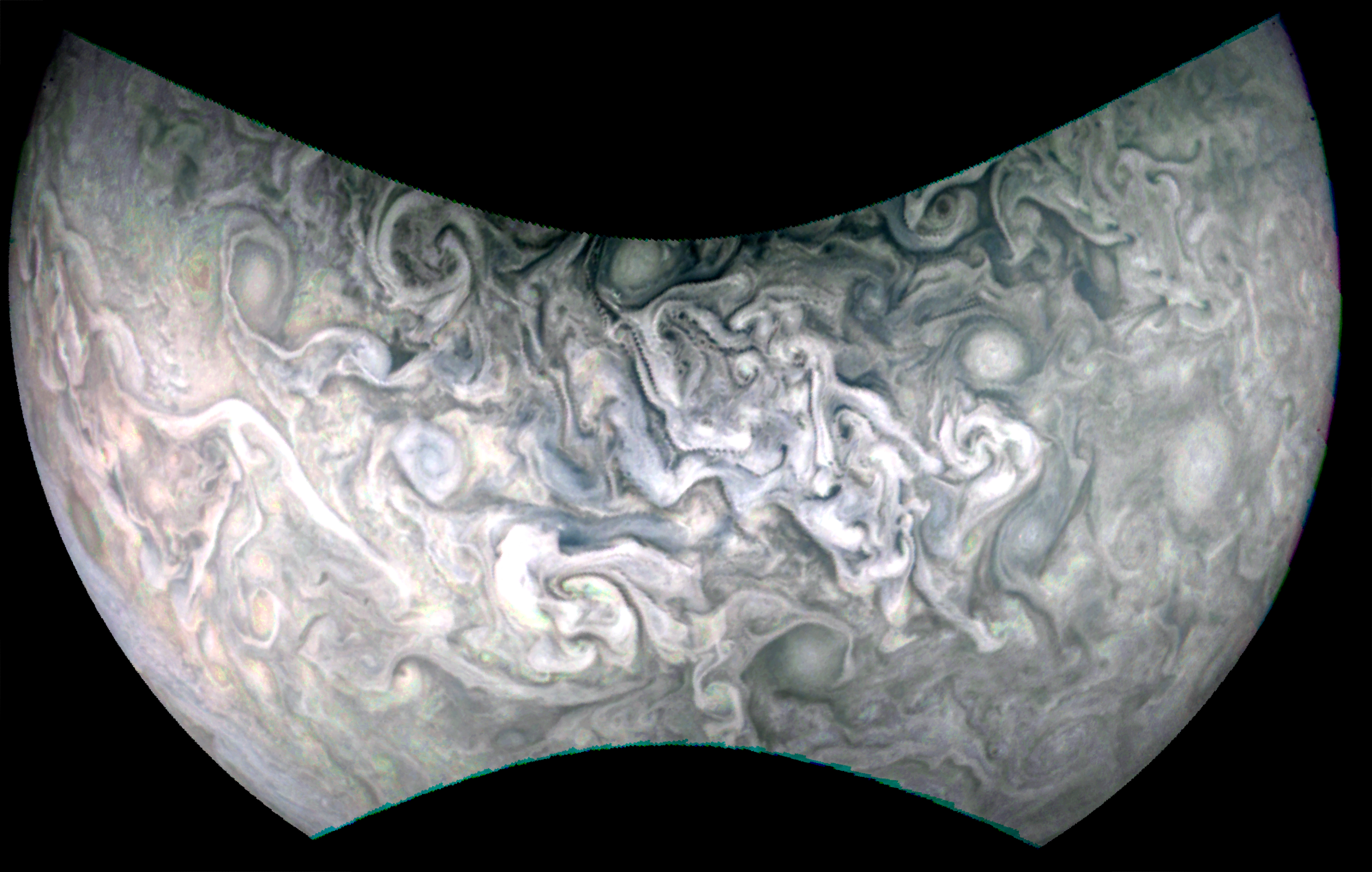 Junocam pixels are 12 bits deep from the camera but are converted to 8 bits inside the instrument using a lossless "companding" table, a process similar to gamma correction, to reduce their size. All Junocam products on the missionjuno website are in this 8-bit form as received on Earth. Scientific users interested in radiometric analysis should use the "RDR" data products archived with the Planetary Data System, which have been converted back to a linear 12-bit scale.