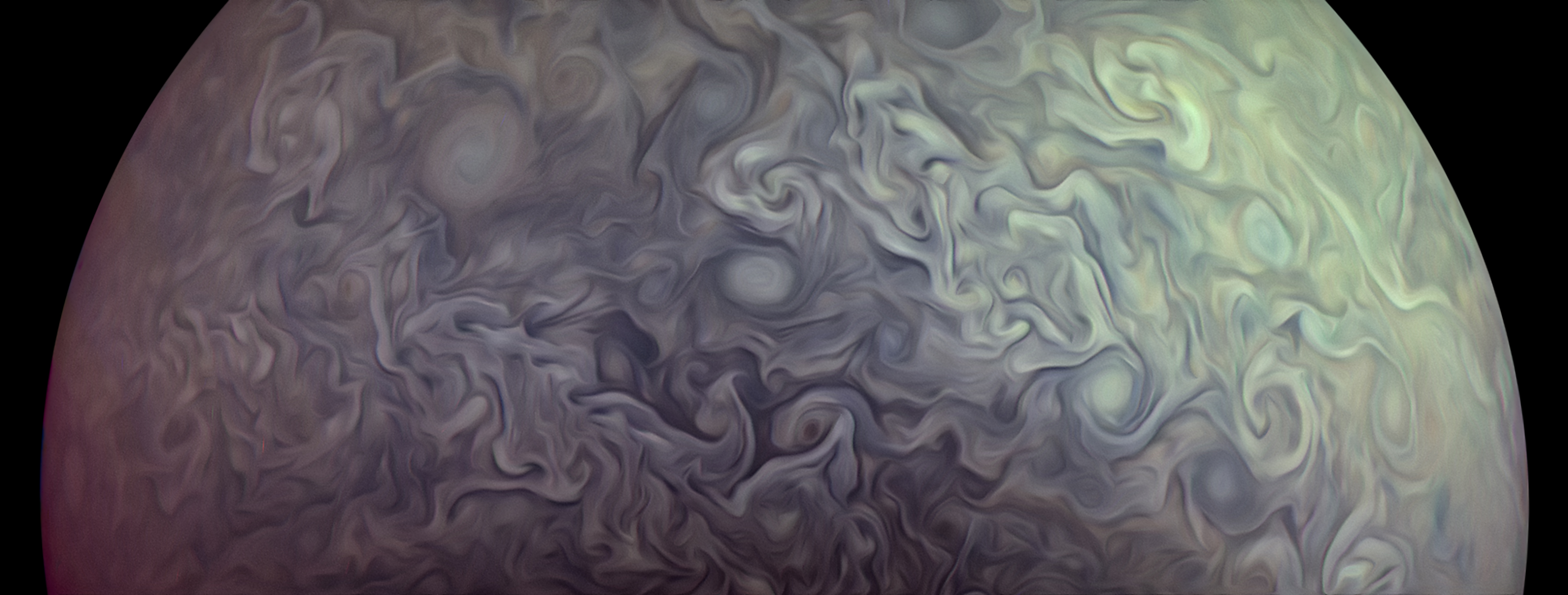 Junocam pixels are 12 bits deep from the camera but are converted to 8 bits inside the instrument using a lossless "companding" table, a process similar to gamma correction, to reduce their size. All Junocam products on the missionjuno website are in this 8-bit form as received on Earth. Scientific users interested in radiometric analysis should use the "RDR" data products archived with the Planetary Data System, which have been converted back to a linear 12-bit scale.