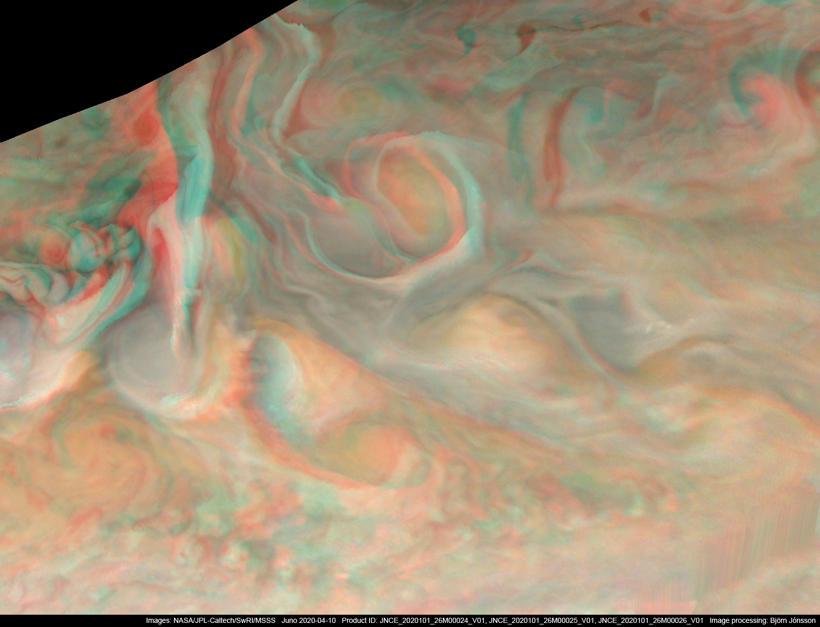 This is an experimental anaglyph created by using methane filter image PJ26_25 to construct a digital elevation model (DEM) of Jupiter's clouds. An enhanced mosaic of images PJ26_24 and PJ26_26 (normal color images) was then draped over the DEM. Here it is assumed that the cloud altitudes are a linear function of brightness in the methane image. This assumption is not accurate but is nevertheless good enough to result in a nice DEM and anaglyph. Elevation differences are exaggerated.