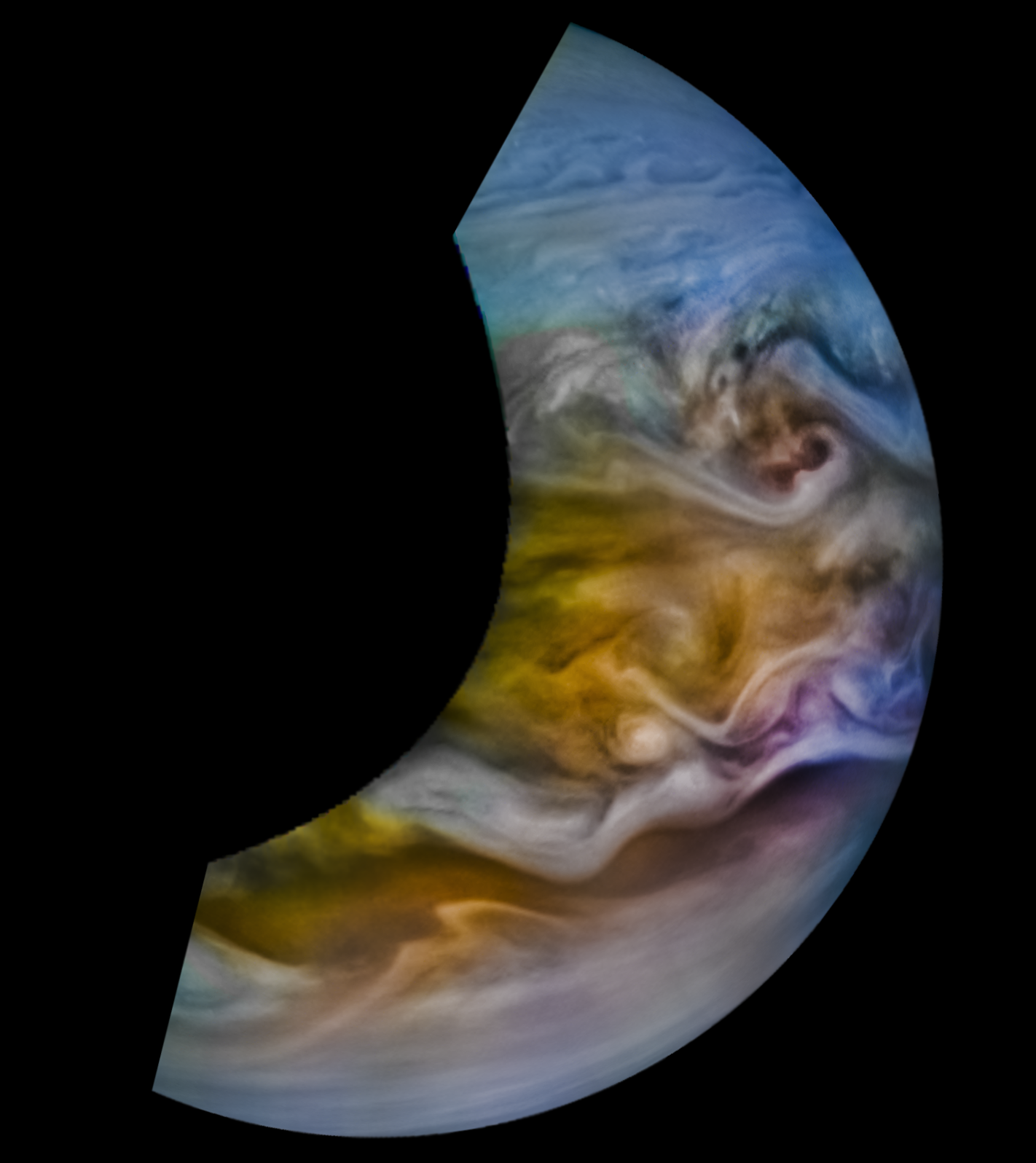 Junocam pixels are 12 bits deep from the camera but are converted to 8 bits inside the instrument using a lossless "companding" table, a process similar to gamma correction, to reduce their size. All Junocam products on the missionjuno website are in this 8-bit form as received on Earth. Scientific users interested in radiometric analysis should use the "RDR" data products archived with the Planetary Data System, which have been converted back to a linear 12-bit scale.