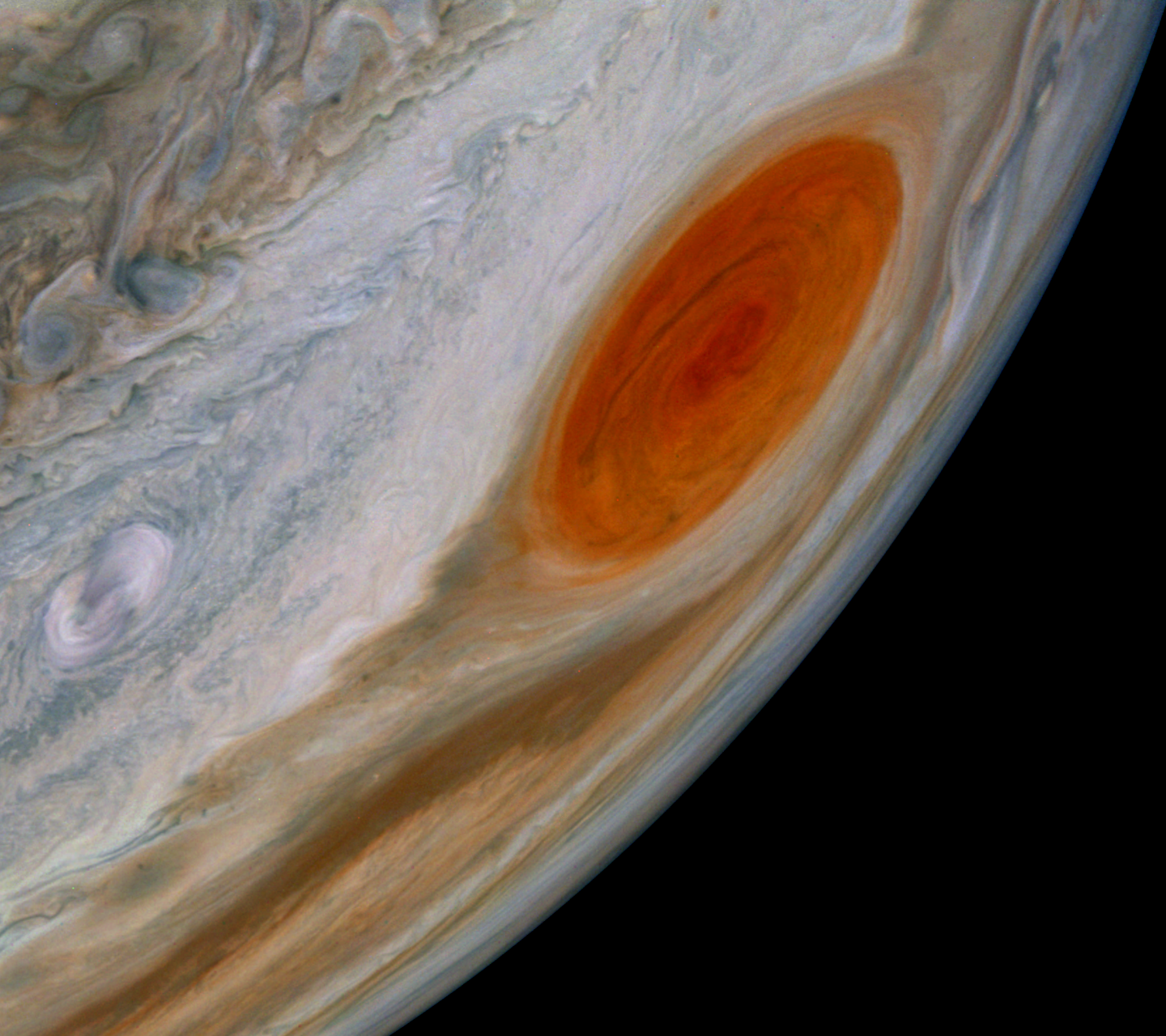 Junocam pixels are 12 bits deep from the camera but are converted to 8 bits inside the instrument using a lossless "companding" table, a process similar to gamma correction, to reduce their size. All Junocam products on the missionjuno website are in this 8-bit form as received on Earth. Scientific users interested in radiometric analysis should use the "RDR" data products archived with the Planetary Data System, which have been converted back to a linear 12-bit scale.