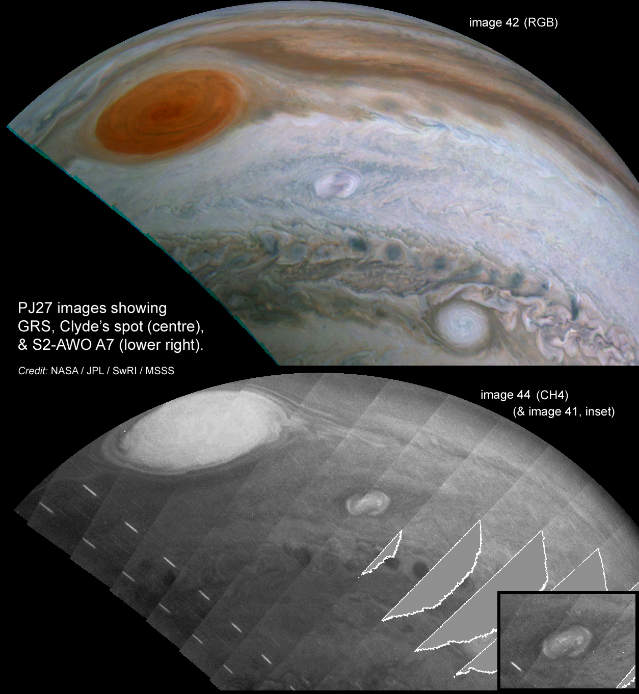 These are the preliminary versions of JunoCam's images of the GRS with 'Clyde's spot'. On 2020 May 31, observer Clyde Foster discovered a new spot that was remarkably bright in the methane band, in the STB latitude south-preceding the GRS, located in a pale cyclonic streak that we had been monitoring for some months. This seems to have been a brief but powerful convective eruption, which may now be evolving into a larger structure. JunoCam got these very fortunate closeups of the early stages. --John Rogers.