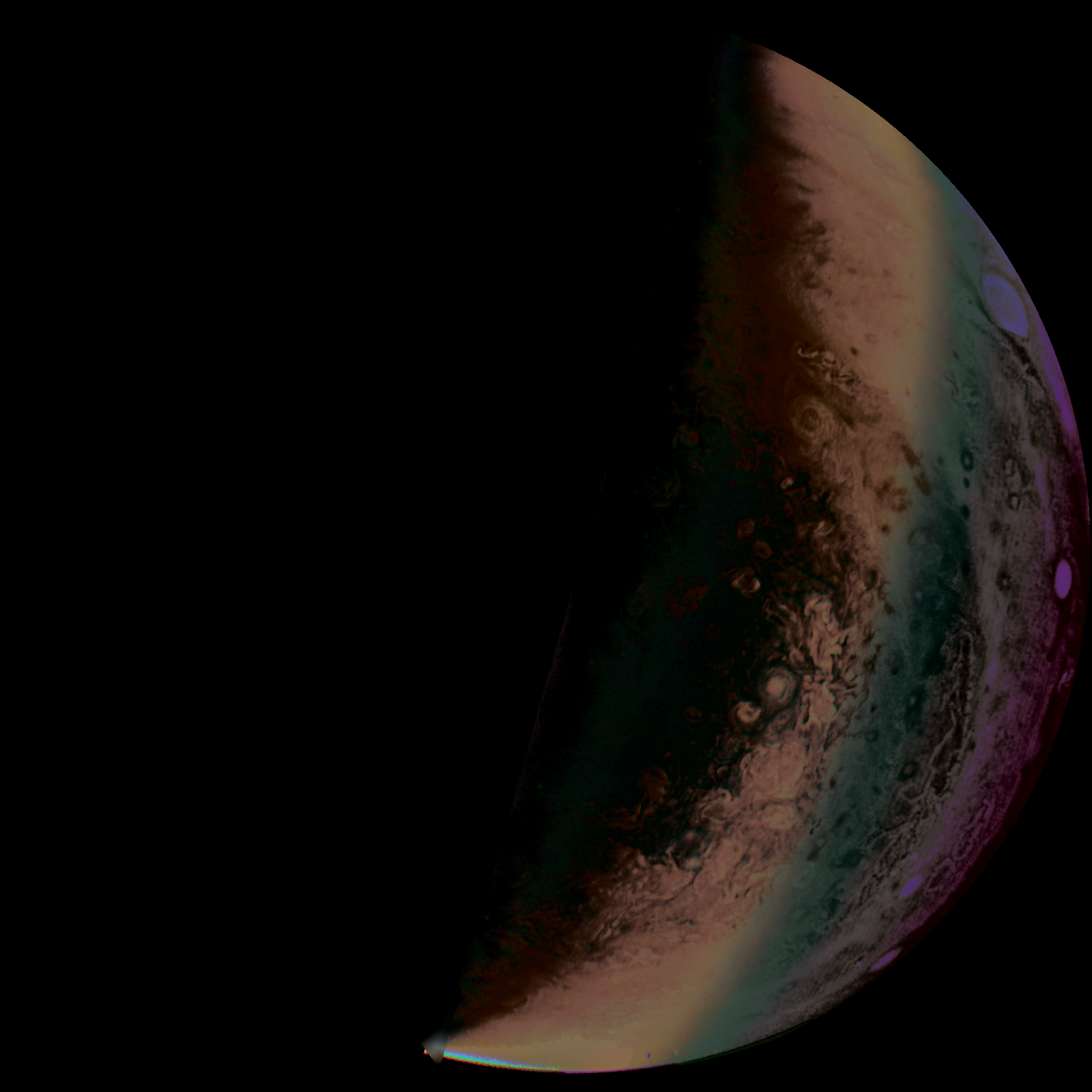 Contrast Enhanced Image of Jupiter's Southern Circumpolar Cyclones False Colors.