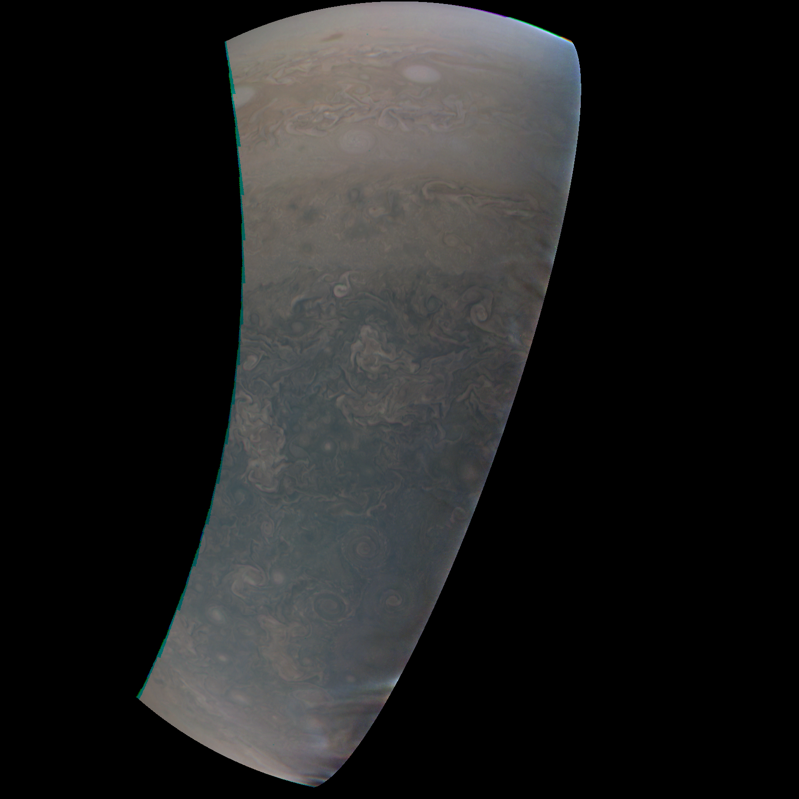 Junocam pixels are 12 bits deep from the camera but are converted to 8 bits inside the instrument using a lossless "companding" table, a process similar to gamma correction, to reduce their size. All Junocam products on the missionjuno website are in this 8-bit form as received on Earth. Scientific users interested in radiometric analysis should use the "RDR" data products archived with the Planetary Data System, which have been converted back to a linear 12-bit scale.