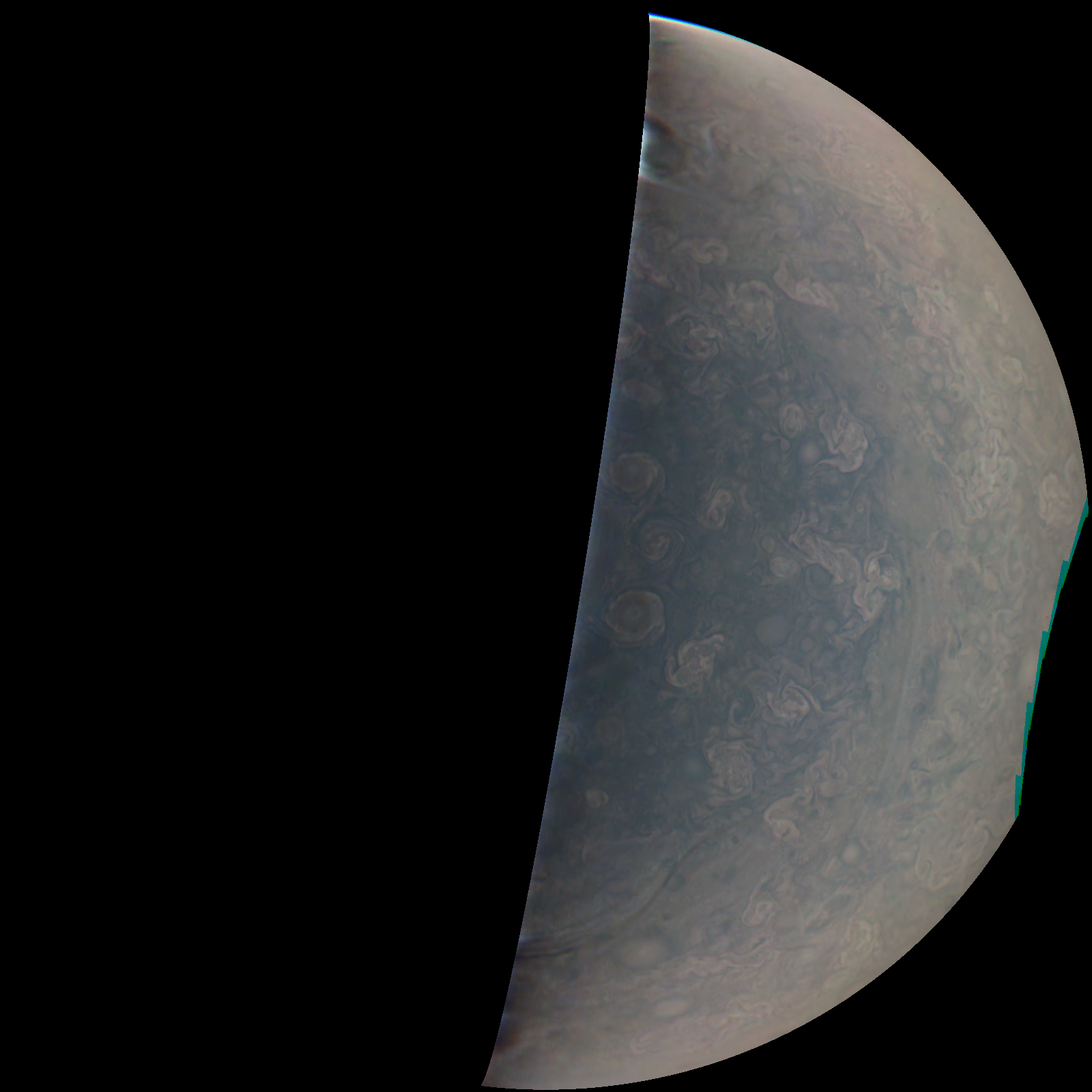 Junocam pixels are 12 bits deep from the camera but are converted to 8 bits inside the instrument using a lossless "companding" table, a process similar to gamma correction, to reduce their size. All Junocam products on the missionjuno website are in this 8-bit form as received on Earth. Scientific users interested in radiometric analysis should use the "RDR" data products archived with the Planetary Data System, which have been converted back to a linear 12-bit scale.
