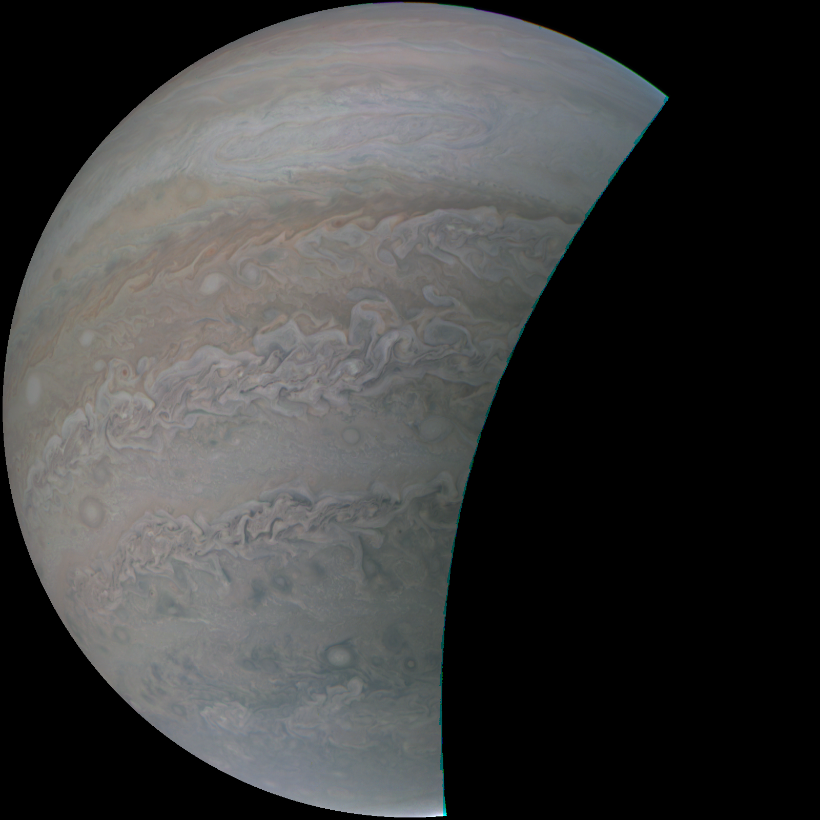 Junocam pixels are 12 bits deep from the camera but are converted to 8 bits inside the instrument using a lossless "companding" table, a process similar to gamma correction, to reduce their size. All Junocam products on the missionjuno website are in this 8-bit form as received on Earth. Scientific users interested in radiometric analysis should use the "RDR" data products archived with the Planetary Data System, which have been converted back to a linear 12-bit scale.