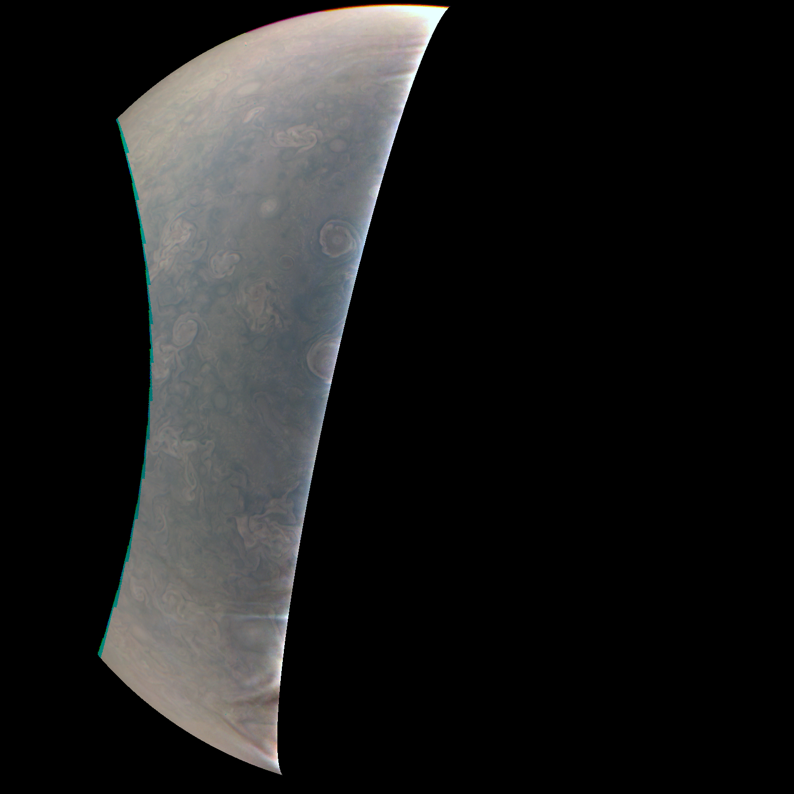 Junocam pixels are 12 bits deep from the camera but are converted to 8 bits inside the instrument using a lossless "companding" table, a process similar to gamma correction, to reduce their size. All Junocam products on the missionjuno website are in this 8-bit form as received on Earth. Scientific users interested in radiometric analysis should use the "RDR" data products archived with the Planetary Data System, which have been converted back to a linear 12-bit scale.