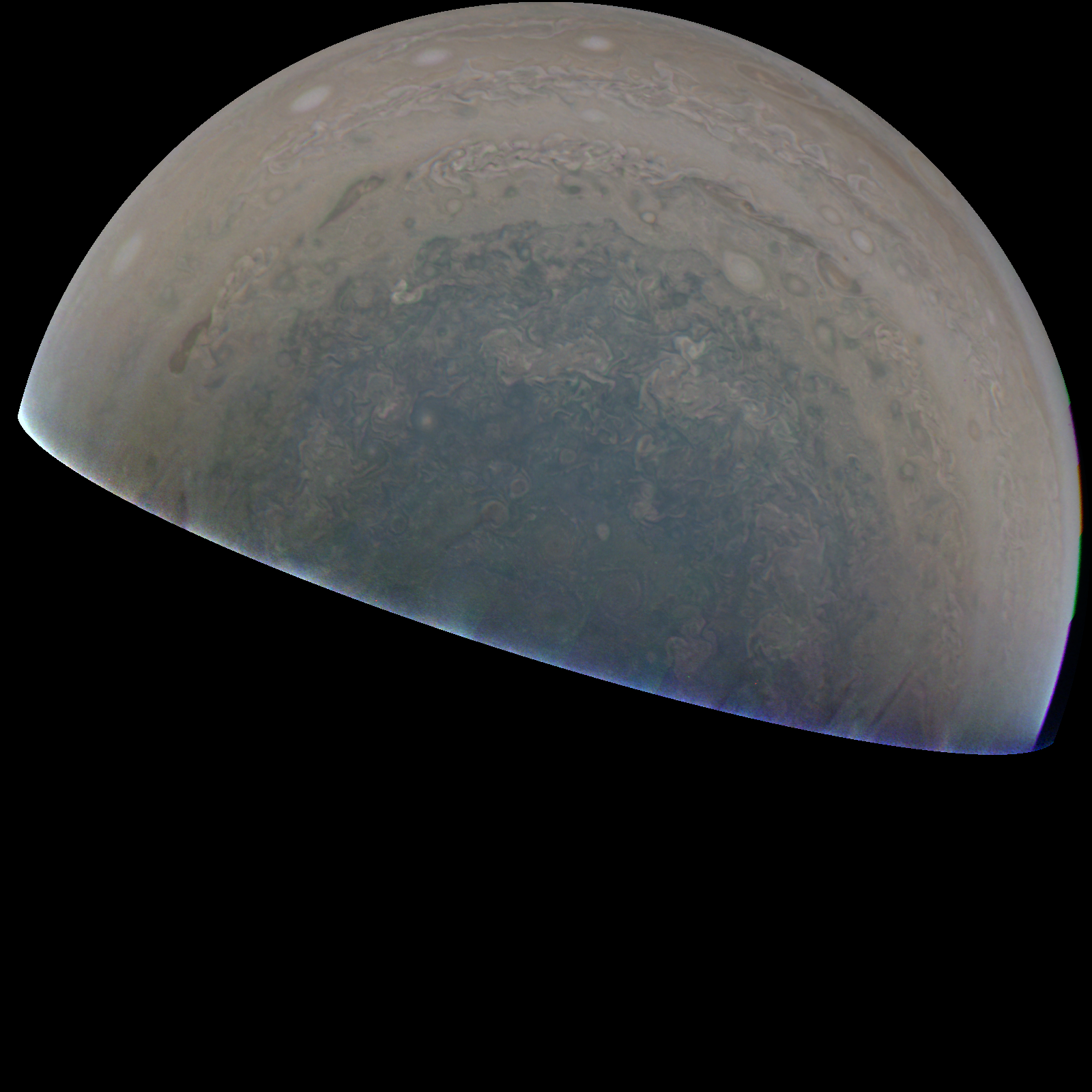 Junocam pixels are 12 bits deep from the camera but are converted to 8 bits inside the instrument using a lossless "companding" table, a process similar to gamma correction, to reduce their size. All Junocam products on the missionjuno website are in this 8-bit form as received on Earth. Scientific users interested in radiometric analysis should use the "RDR" data products archived with the Planetary Data System, which have been converted back to a linear 12-bit scale.