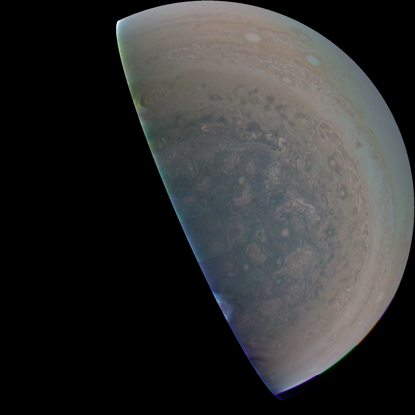 Junocam pixels are 12 bits deep from the camera but are converted to 8 bits inside the instrument using a lossless "companding" table, a process similar to gamma correction, to reduce their size. All Junocam products on the missionjuno website are in this 8-bit form as received on Earth. Scientific users interested in radiometric analysis should use the "RDR" data products archived with the Planetary Data System, which have been converted back to a linear 12-bit scale.