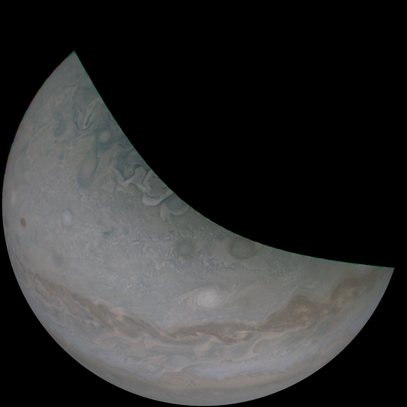 Junocam pixels are 12 bits deep from the camera but are converted to 8 bits inside the instrument using a lossless "companding" table, a process similar to gamma correction, to reduce their size. All Junocam products on the missionjuno website are in this 8-bit form as received on Earth. Scientific users interested in radiometric analysis should use the "RDR" data products archived with the Planetary Data System, which have been converted back to a linear 12-bit scale.