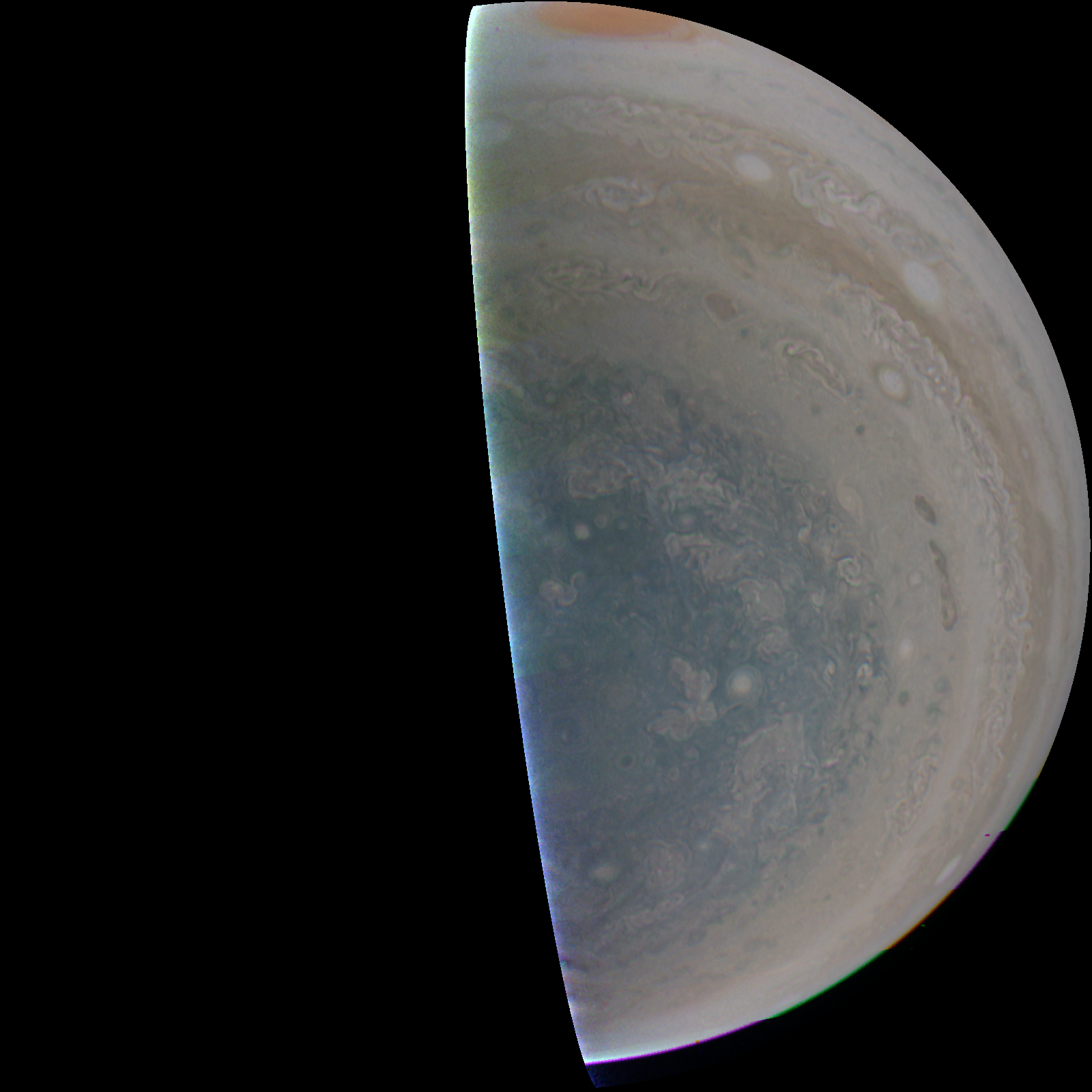 Junocam pixels are 12 bits deep from the camera but are converted to 8 bits inside the instrument using a lossless "companding" table, a process similar to gamma correction, to reduce their size. All Junocam products on the missionjuno website are in this 8-bit form as received on Earth. Scientific users interested in radiometric analysis should use the "RDR" data products archived with the Planetary Data System, which have been converted back to a linear 12-bit scale.