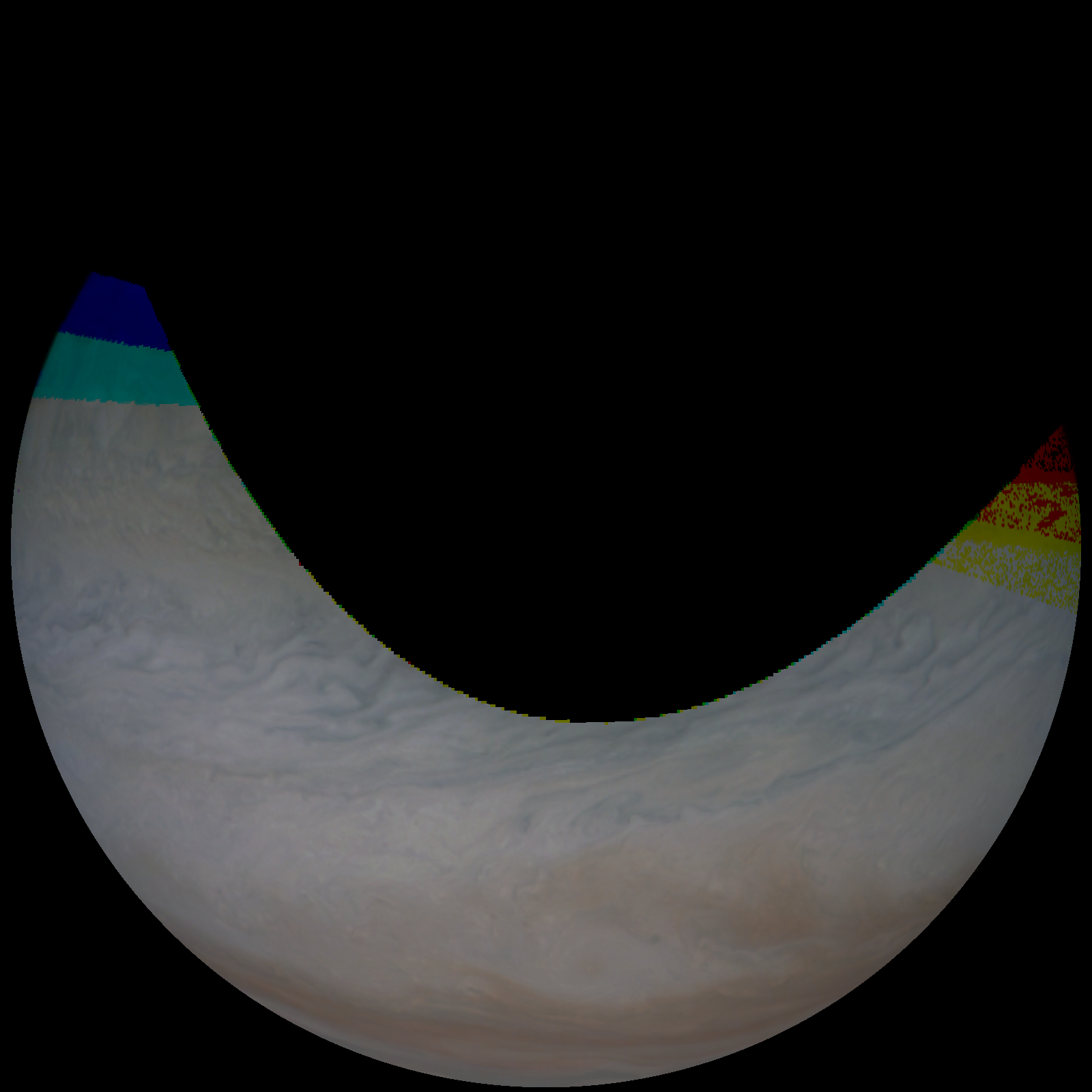 Junocam pixels are 12 bits deep from the camera but are converted to 8 bits inside the instrument using a lossless "companding" table, a process similar to gamma correction, to reduce their size. All Junocam products on the missionjuno website are in this 8-bit form as received on Earth. Scientific users interested in radiometric analysis should use the "RDR" data products archived with the Planetary Data System, which have been converted back to a linear 12-bit scale.