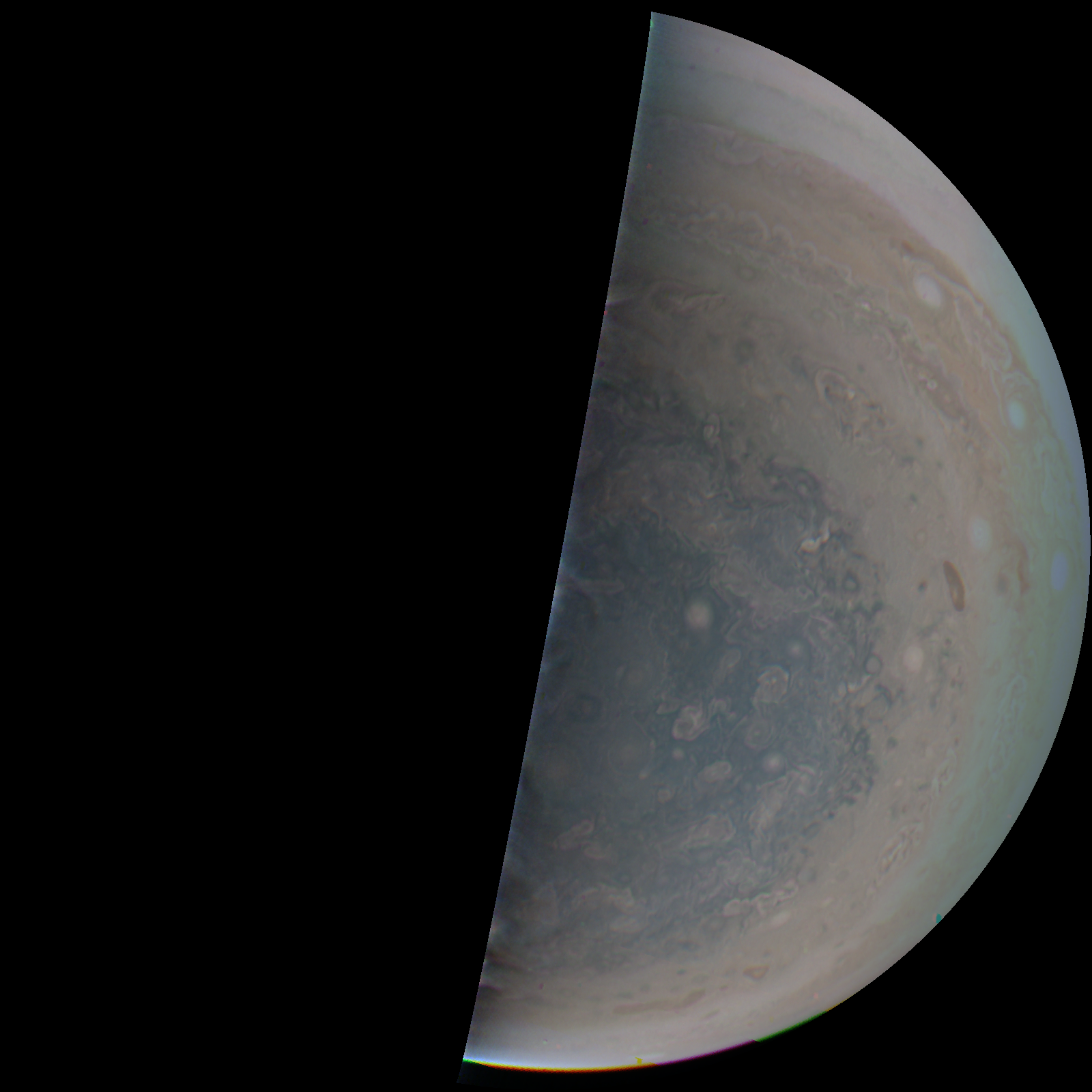 Junocam pixels are 12 bits deep from the camera but are converted to 8 bits inside the instrument using a lossless "companding" table, a process similar to gamma correction, to reduce their size. All Junocam products on the missionjuno website are in this 8-bit form as received on Earth. Scientific users interested in radiometric analysis should use the "RDR" data products archived with the Planetary Data System, which have been converted back to a linear 12-bit scale.