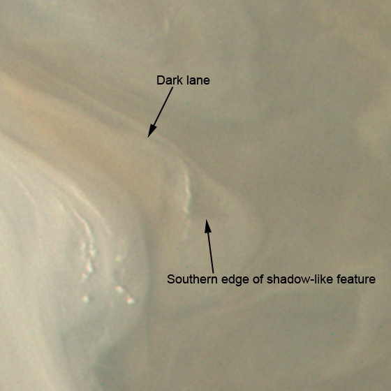 Bjorn, thanks for your comment on that shadow-like feature. I think you may be right. In fact, after enhancing the contrast on your illustration, there seems to be a more plausible shadow right next to the central, brightest part of the 'cloud ridge, of similar width to other cloud shadows in the image, but the much larger shadow-like feature extending to the right is not quite so dark. Perhaps it is an albedo feature or an area of thinner cloud, like the dark lane you refer to. --John.
