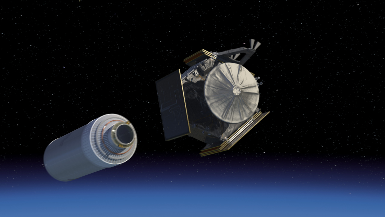 This still image from a Juno mission animation shows the spacecraft soon after launch as it separates from its Centaur upper rocket stage. The Juno spacecraft is in its stowed-for-launch configuration here, with its three large solar arrays folded against its sides.