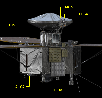 The Juno spacecraft has five antennas, including the largest and primary communication antenna, known as the high-gain antenna (HGA). Four other antennas can be used as backups, or when the main antenna is pointed away from Earth, for certain science operations and navigation maneuvers.