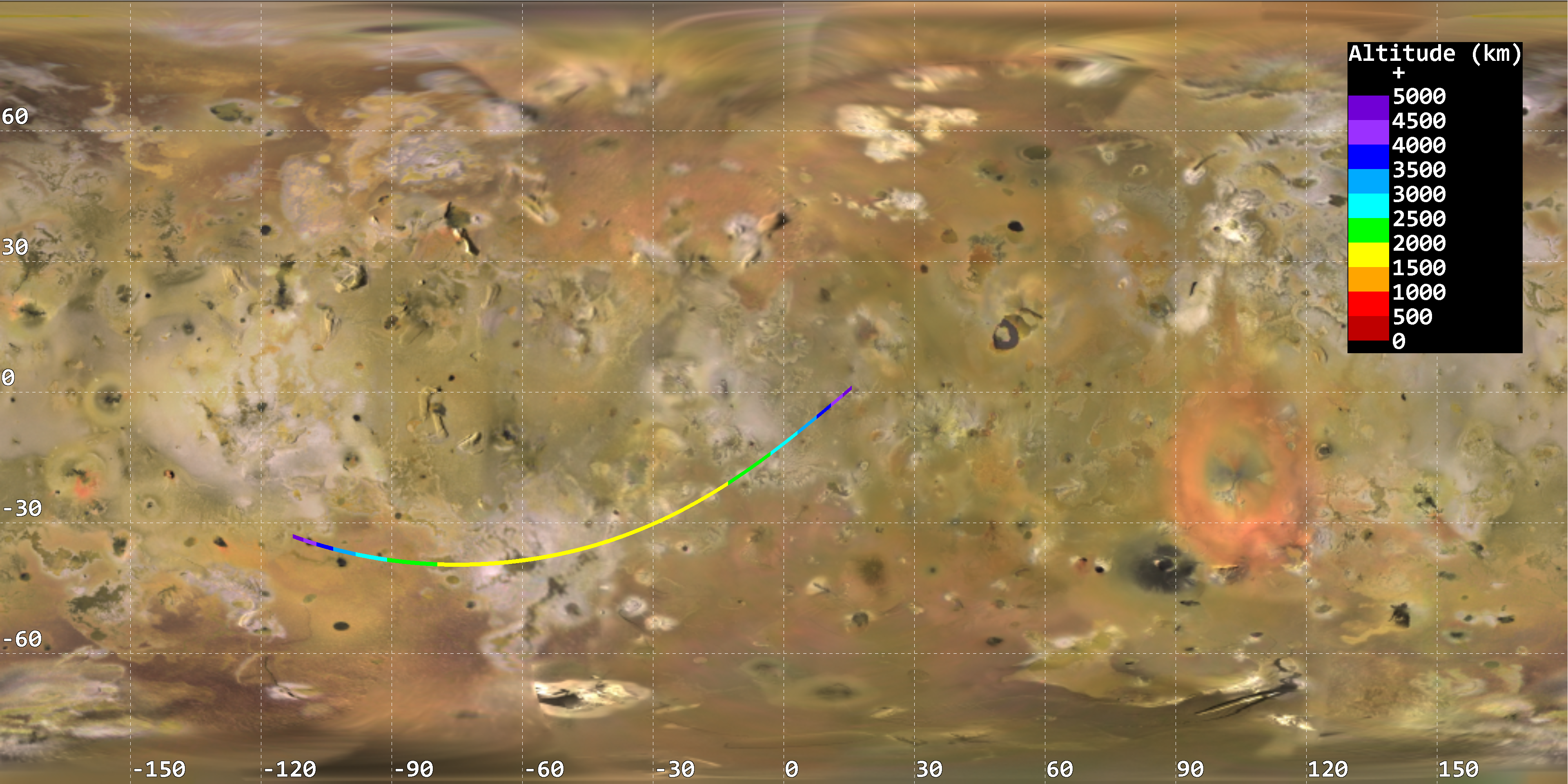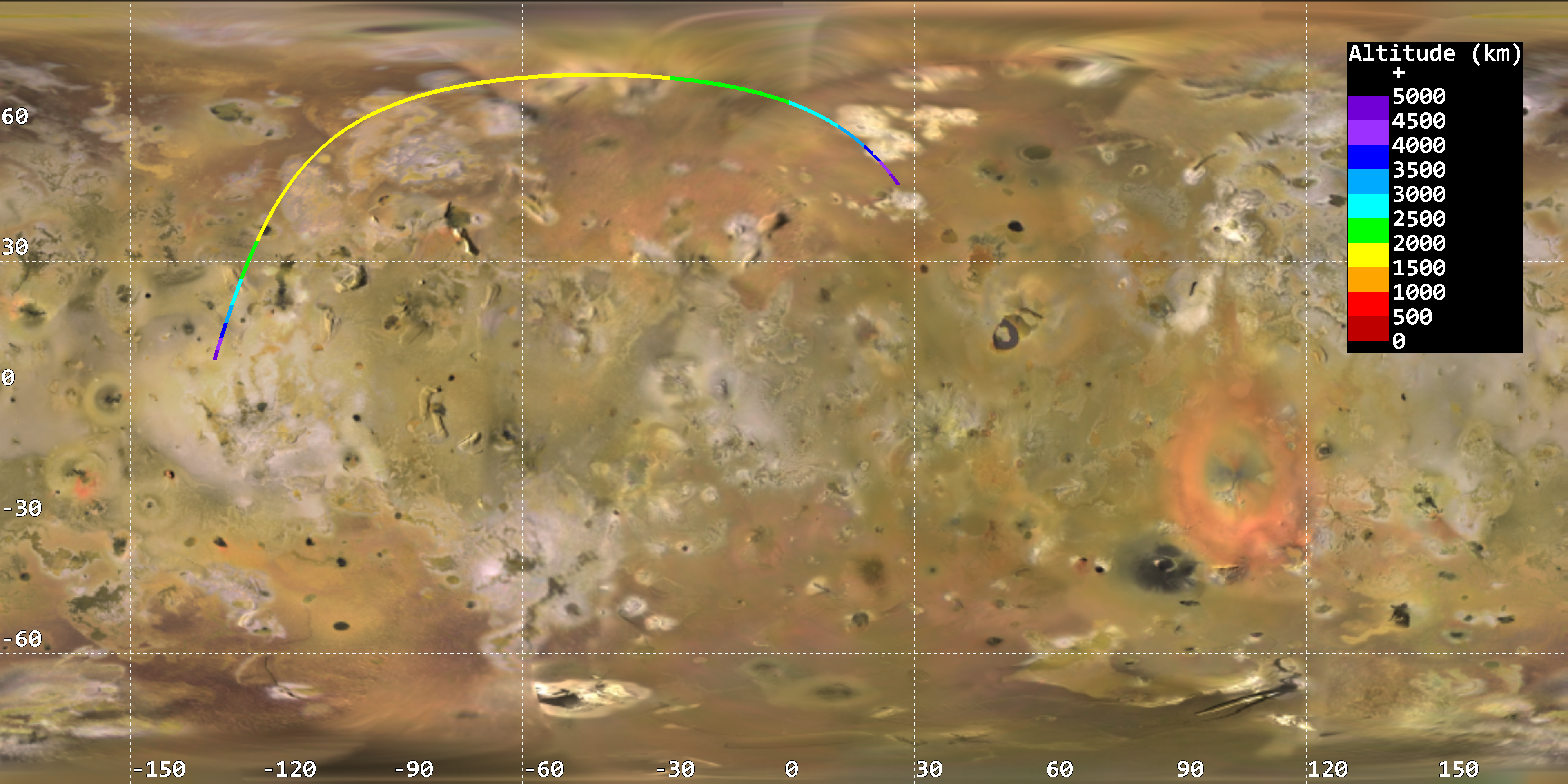 This figure provides a trace of the predicted ground track when Juno spacecraft is scheduled to fly past Io on December 30, 2023, prior to the 57th perijove. The track is colored as a function of altitude from the moon’s surface, see the legend, with a minimum predicted flyby altitude of ~1500 km. West longitude increases to the left of the prime meridian (in the center of the figure).