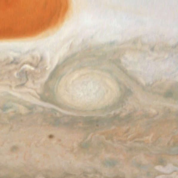 The counterclockwise motion of the storm, called Oval BA, is clearly on display. A similar rotation can be seen in the famous Great Red Spot at the top of the animation.