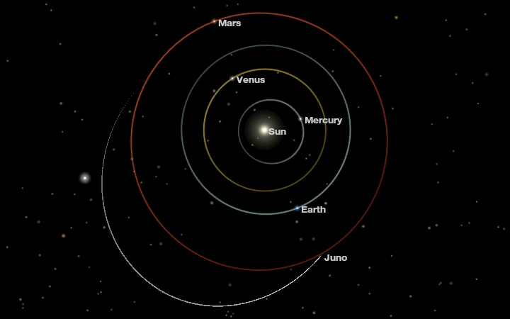 from Earth. The one-way radio signal travel time between Earth and Juno is