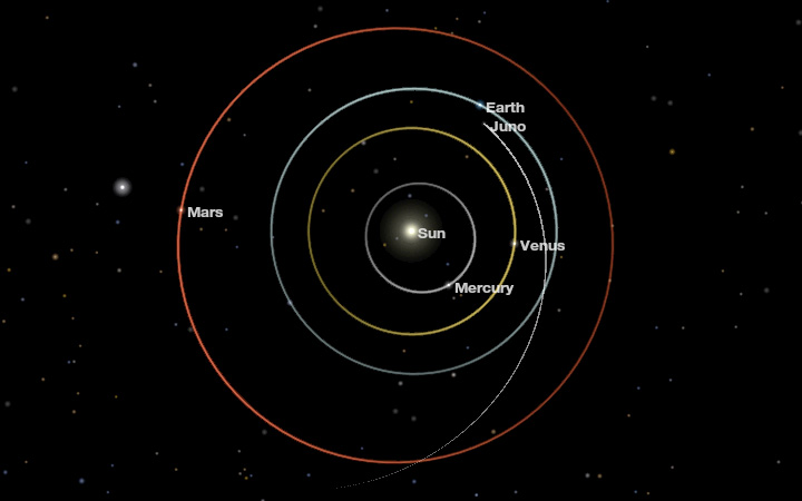 Juno is, technically speaking, already on course for Jupiter arrival in July 2016. The spacecraft must still fly by the Earth to receive the gravity assist it needs in order to reach Jupiter, but the recent set of trajectory control maneuvers put Juno on the required path to achieve its gravity assist as planned.